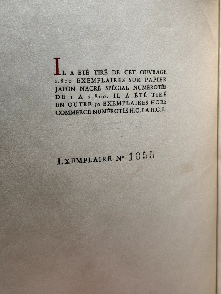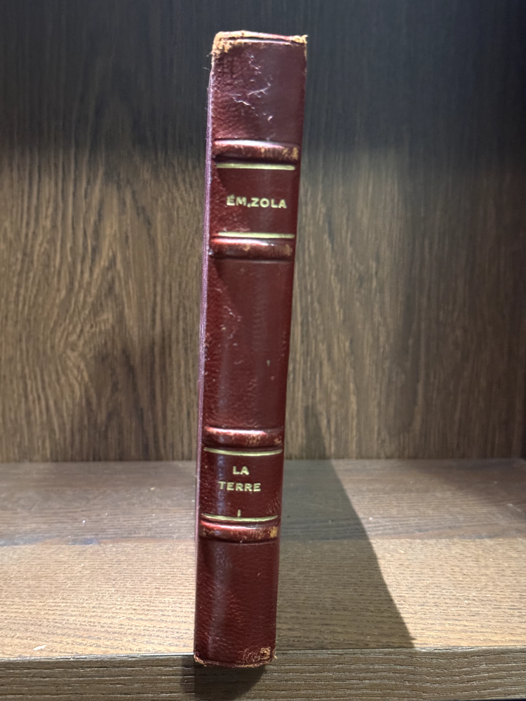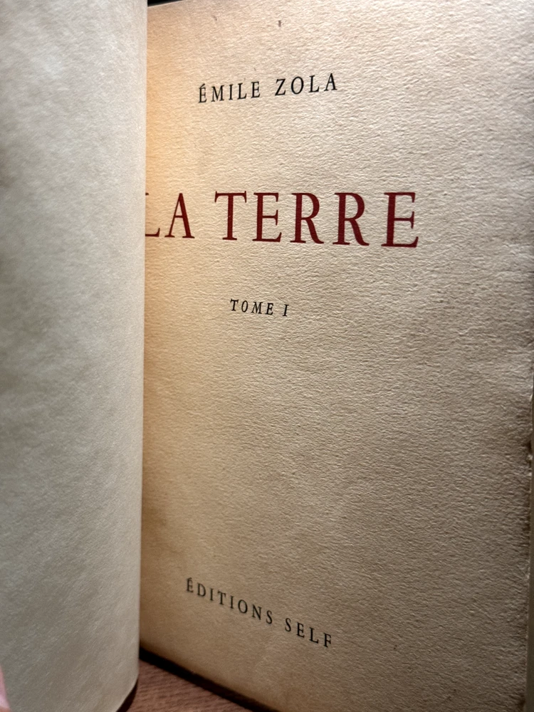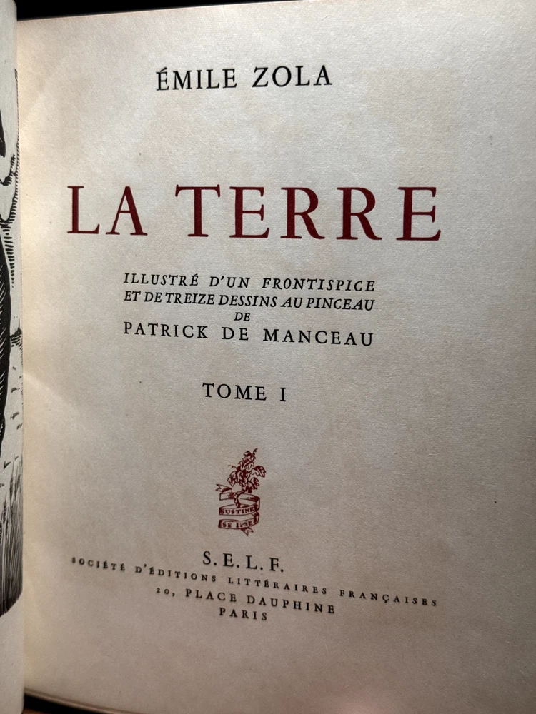 LA TERRE by Emile Zola, 3/4 Leather Bound Limited NUMBERED EDITION, number 1055 in FRENCH. Vol 1. Illustrated by Patrick Manceau Published by the Societe D'Editions Litteraires Francaises Features a frontispiece and other designs by Patrick Manceau. Very fine mosaic marbling on the endpages. Beautiful and lush red leather 3/4 binding, with leather tooling on the spine. See my other listings. I have a large collection of rare and collectible books, most leatherbound, others of first edition, first printing, even unpublished manuscripts. I will combine them during shipping so you can receive them together. Just message me your intent to buy more than one book, and I will hold them to be shipped together. Happy Buying!