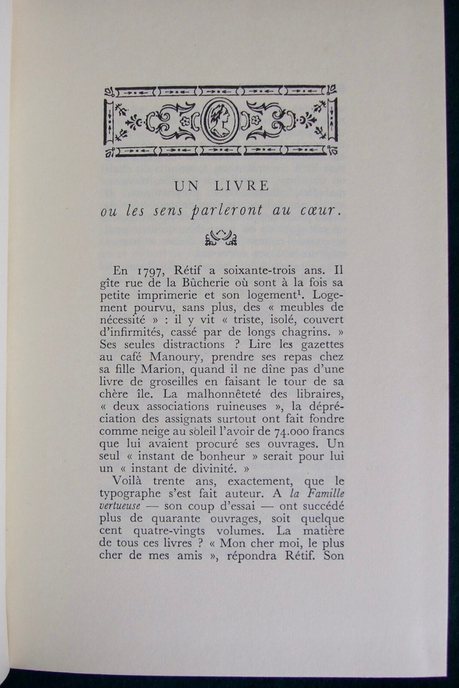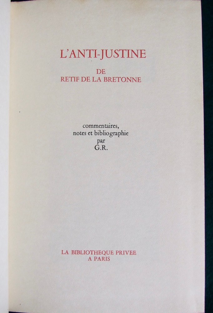 The Bookfinder General Specialists in RARE & Antiquarian books L'Anti-Justine By Retif De La Bretonne Publisher: L'Or du Temps, Bibliothéque Privée, 1969. Bound in full black leather, title and decorations in gilt on the spine and decorations in gilt on the top board. Red endpapers and ribbon bookmark. Facsimile of the 1798 edition, with commentary, notes and bibliography by G.R. Very good condition, with a scatter of foxing to the closed page edges, otherwise clean and bright and tight in its binding. Limited edition, number 368. 20.5cm, 8 inches, tall, 69pp, 252 pages, (4). postage & packing Delivery costs for this item are: free for UK only. Why not visit our eBay shop The Bookfinder General , for books of all kinds. Please email us for more details about any book you may be interested in. We try to fully describe every book as clearly as we can, but if you are unsatisfied with your purchase, please contact us as soon as possible. We prefer returns to be made within 7 days of receipt of the book, and we will refund your winning bid price. If your book has not been delivered, contact us and we will go through the process of getting compensation from the Post Office. This does take some time, and we will keep you informed. Buy with confidence from a trusted seller - see my 'About Me Page Don't forget to look at my other items.
