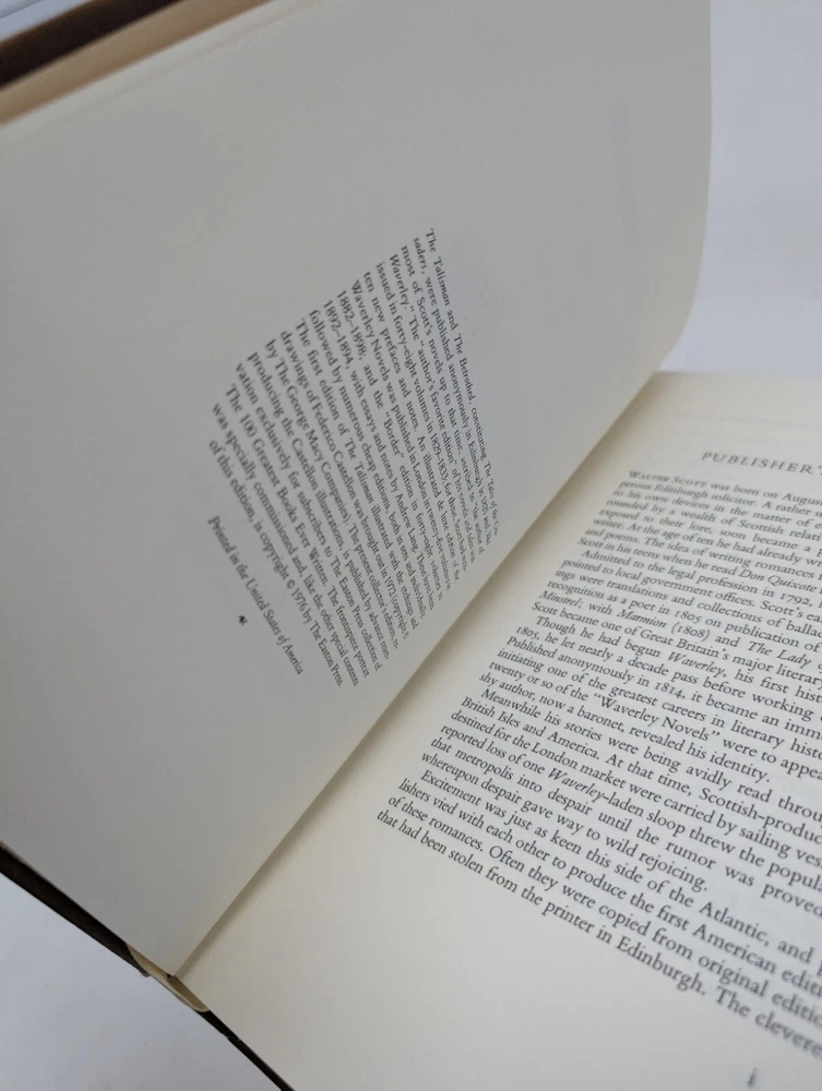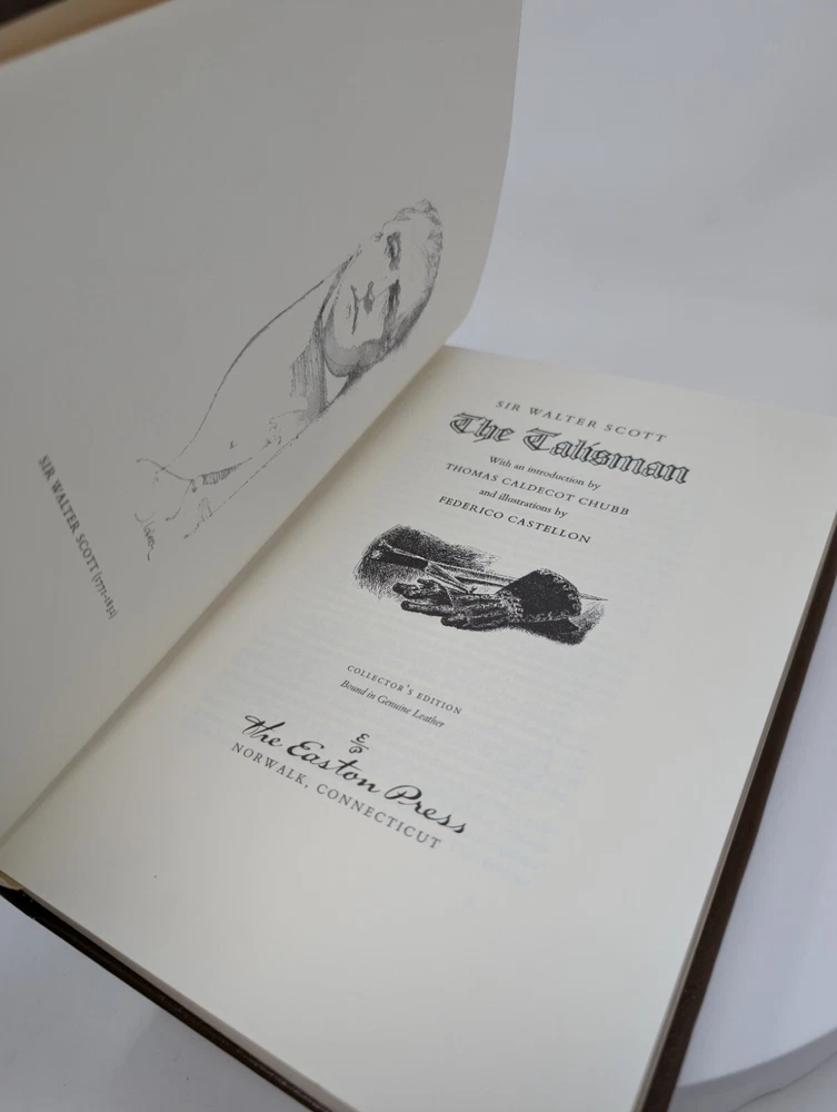 1976 Easton Press The Talisman fully bound in genuine leather! Your bookshelf will love this full leather bound version of The Talisman by Sir Walter Scott! Fully bound in tan leather with gilt accents, textured end papers, and gilded textblock, this illustrated edition of this famous novel will look amazing in your collection and will be a joy to read! This edition is likely the 1 st Easton Press edition, copyright 1976. Condition: This book is in NEAR FINE condition! It shows very few signs of use or wear and is free from flaws and damage. Very light surface wear (almost imperceptible) to front cover. The book appears unread. Measurements (approx): Size: 7 in by 10 in I offer a 30-day money-back refund if you are not satisfied with your purchase for any reason if the item is returned in the same condition as to how it was sent. Thank you for looking, and I hope to have your purchase and satisfaction! A Bit About from Whom You Are Buying: I have 100% positive feedback and have been selling on eBay since 2006. Your item will come from a pet and smoke-free home. I hope that your experience with the item you purchase is as satisfactory as my joy in obtaining and listing the item. I would appreciate positive feedback if you are satisfied with your purchase. If you are not satisfied, please let me know and allow me the opportunity to make it right. Thank you for looking and I look forward to having your business! My Hours I will respond to requests, returns, concerns, and questions Monday through Friday, 10 am – 6 pm Eastern Time. Friday and weekend orders usually ship out the following Monday. Returns: I accept a no-questions-asked money back return policy granted the request is made up to 30 days after the item arrives. I refund only the purchase price of the item and, if free return shipping is offered on the listing, the full return shipping. It is your responsibility to return the item to me in the same condition it was sent to you. If the item is returned in an inferior condition as to how it was sent, a full return might not be granted. New items that come back in an inferior condition or are removed from their original packaging will not be granted a full refund. ***International Customers Only: Unless otherwise stated, I do not accept international returns at this time.*** Payment: Payment must be received no later than 7 days after the auction closes. If you cannot pay within this time, please contact me with detailed instructions on how you would like to purchase the item. If payment is not received, and/or contact has not been made within this time, the sale will be canceled. International Bidders: I ship through the Global Shipping Program. All international shipping quotes reflect import taxes and duties, as well as total shipping cost.