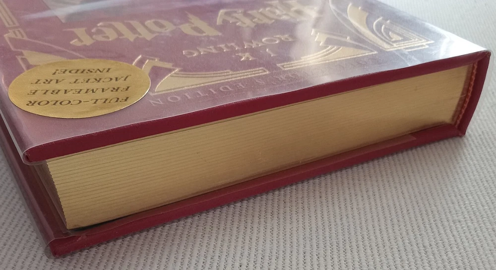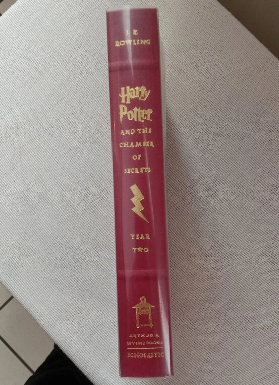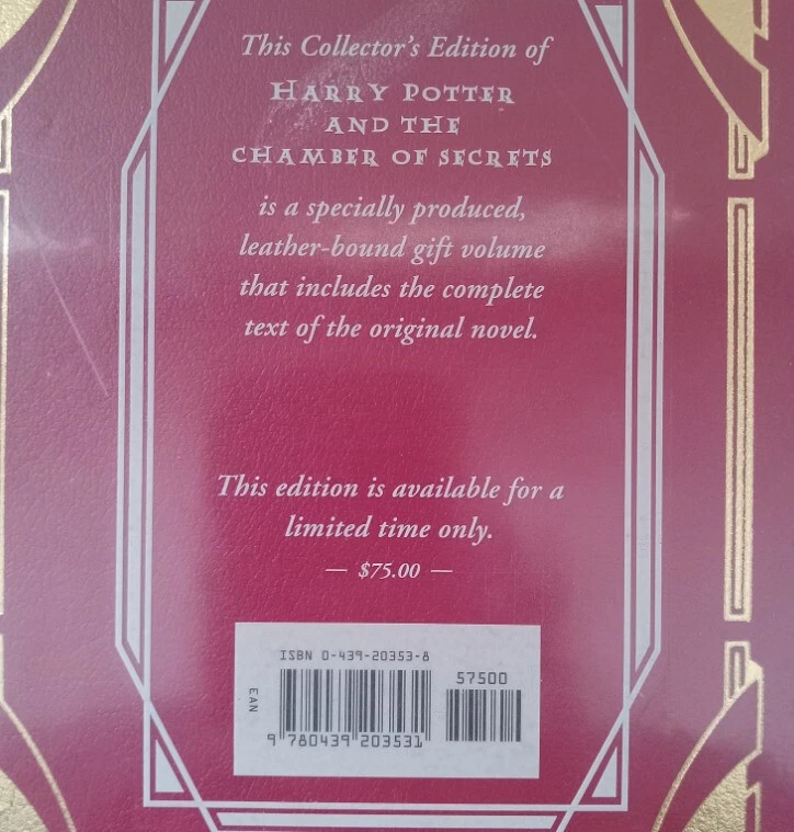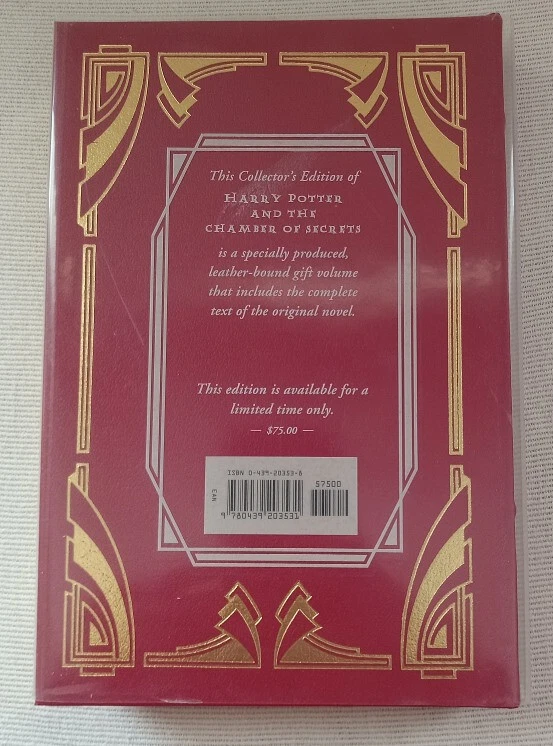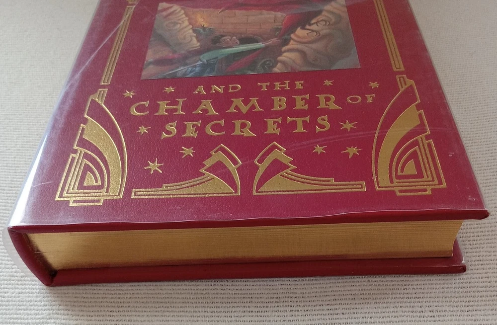 Leather-Bound Collector's Edition - UNREAD Harry Potter And the Chamber of Secrets by J.K. Rowling Full- Color Frameable Jacket Art, still in-tact Collector's edition of Harry Potter and the Chamber of Secrets by J.K. Rowling. Red leather cover with original Mylar protective cover. Beautiful Gold gilded page edges. First Edition, First Printing with correct numberline for first printing of this edition. Printed in USA October 2002. Includes the full color frameable cover art which is still in-tact and never removed. (See photo) Condition: Excellent condition! Never read - binding is tight and book is square with no leans. Gilding is clean and intact. No noticeable edge wear. Box shipped and protected for transit. Comes to you from a Non-smoking, Pet free home.