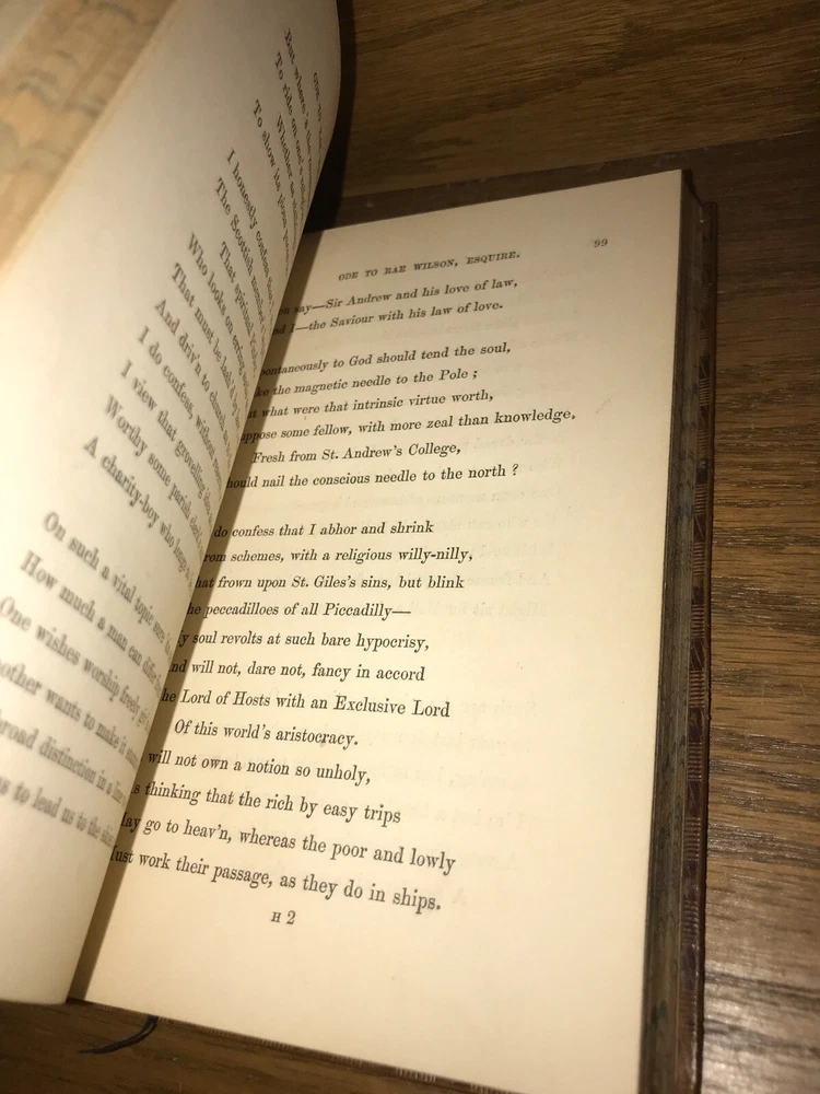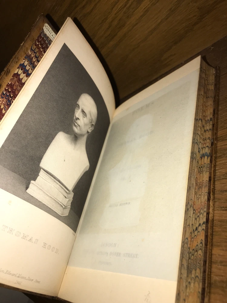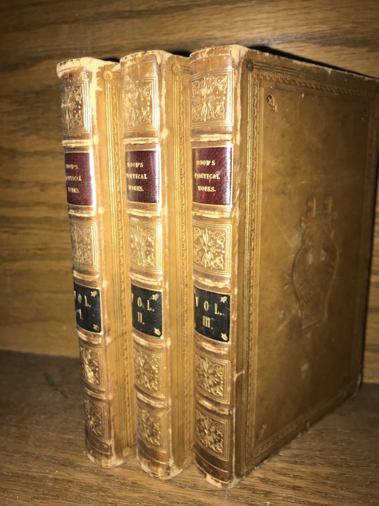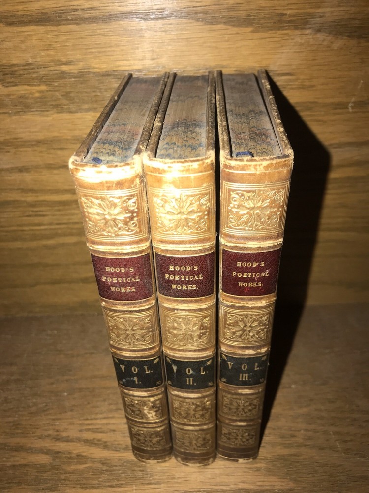 The complete works of H ood . Complete in 3 volumes. Printed in 18 46. The bindings are original. Bound in full calf leather. Leather is still supple and fresh. Quality rag paper. In very good condition. Quality paper. These are the original bindings. Full calf leather. Intricate lyre motif. Set is in remarkable condition. In highly giftable condition. This would make an excellent gift. In remarkable condition. Despite the sheer age. Especially for being over 150 years old. Leather supple. Hinges sound. Some light generalized wear. Light wear as shown in the pictures. Quality paper. Approximately 7 inches tall. This will be well protected for shipping via Priority Mail. 2022.04.04 .17 h sngls tl