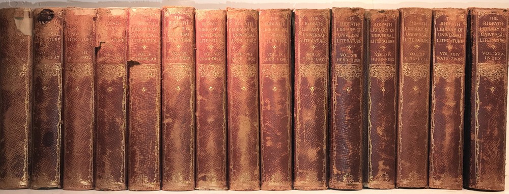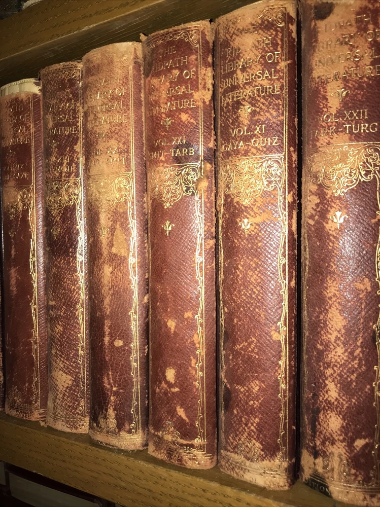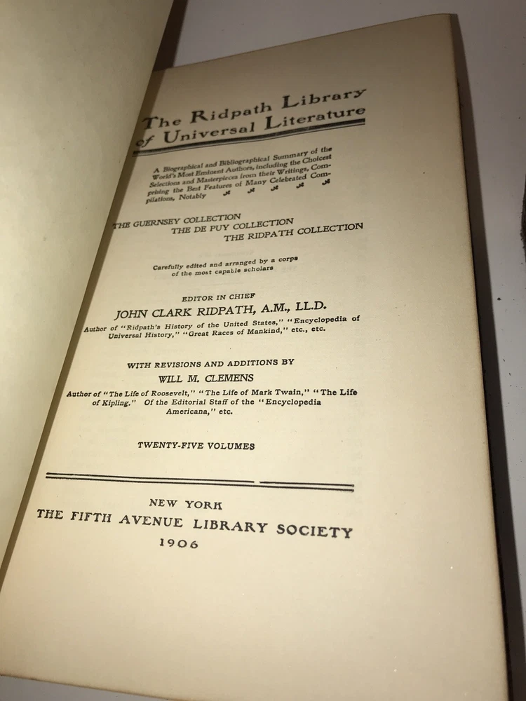 Bound in genuine leather. Complete in 25 volumes. Copyright 1906. Gilded title pages. Limited edition. Bound in full leather. Full leather is more expensive. All edges cases in gilt. Set has obvious generalized wear and some damage. Chipping. Chipping at the heads of the spines as shown in the pictures. Hinges strongly attached but have starting. Spines are heavily scuffed. Some dirt, some staining, some bowing to some covers. Quality paper. Still an attractive rustic set where condition is not critical. If you care about condition please do not buy this set. It is intended as an old rustic antiquarian display set. If you’re looking for an old encyclopedia this might be a good alternative to the britannica eleventh edition. Each book will be individually wrapped and well protected for shipping.