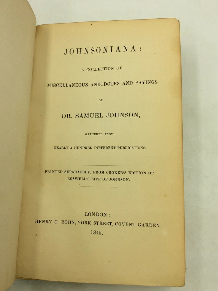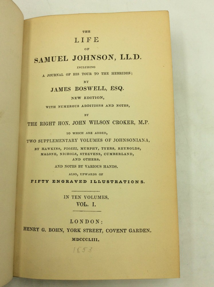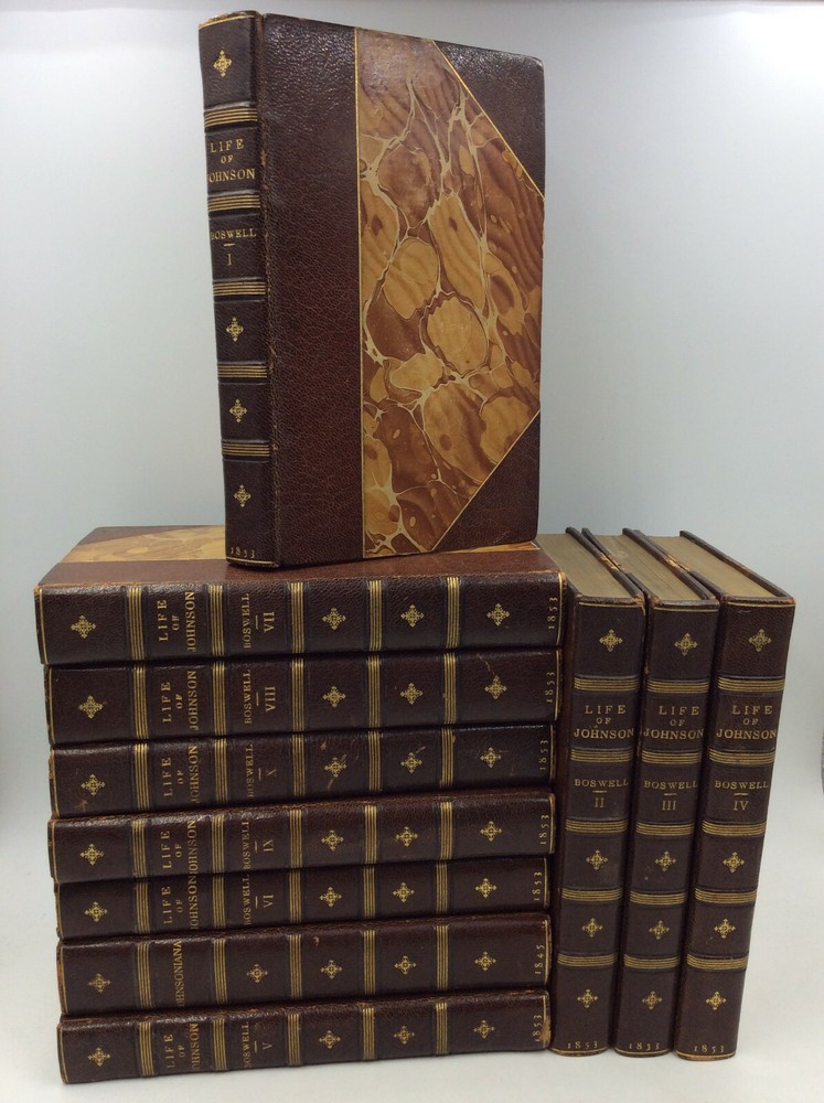 James Boswell as edited by John Wilson Croker THE LIFE OF SAMUEL JOHNSON with JOHNSONIANA: 10 volumes London: Henry C. Bohn, 1853. Leather bound. The Croker Edition of Boswell complete in ten volumes. Uniformly bound in 3/4 brown leather and marbled boards. Gilt decorated spines; marbled endpapers; top edges gilt. In addition, there is an extra volume added in the same matching binding which is an 1845 edition of Johnsoniana where the two volumes are bound as one. A few touches of shelf wear but the set in overall fine condition. Includes all engraved plates and frontispieces called for. Small octavos, measuring 4x7 inches. Item #1230760 Includes Boswell's Life of Johnson plus the Tour of the Hebrides in vols. I-VIII plus two volumes of Johnsoniana. This book is offered by Kubik Fine Books Ltd. Established in 1985, our store is in Dayton, Ohio, and specializes in rare/antique books of all types, with a special emphasis on history and theology. We are a member firm of the two most prestigious organizations in the rare books trade: the Antiquarian Booksellers Association of America (ABAA) and the International League of Antiquarian Booksellers (ILAB). As such, we are bound by their strict code of ethics and standards - in other words, you can trust us to be reputable, knowledgeable professionals. All items are guaranteed to be as described and can be returned for a full refund. Autograph material is guaranteed in perpetuity to be authentic. ORDER ADDITIONAL BOOKS AND SAVE! We will combine shipping on multi-book purchases. For shipments within the USA, shipping is $2.00 per book for each additional one purchased. Orders must be paid for at the same time. A FEW WORDS ON SHIPPING: Our shipping charges may be higher than other sellers. That's because we have a dedicated shipping employee and take care to make sure your orders are well-protected. Every item is wrapped in bubble-wrap; in addition, everything item which sells for over $10 is shipped in a sturdy cardboard box with cushioning materials. Over 95% of our orders are shipped within one business day of when we receive payment. If you buy it tonight, it's en route tomorrow!