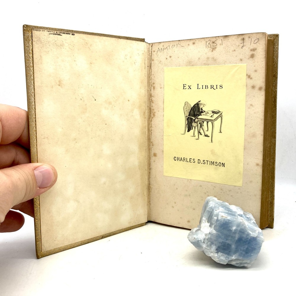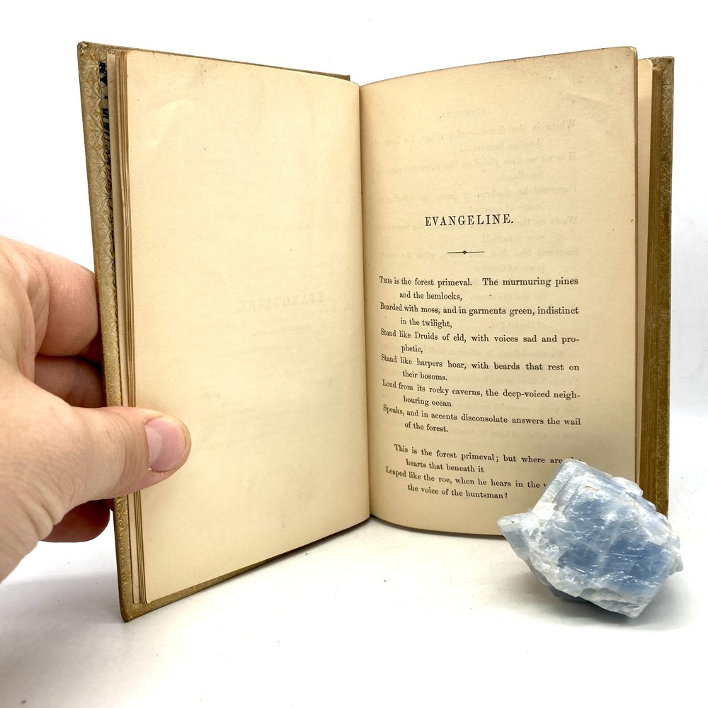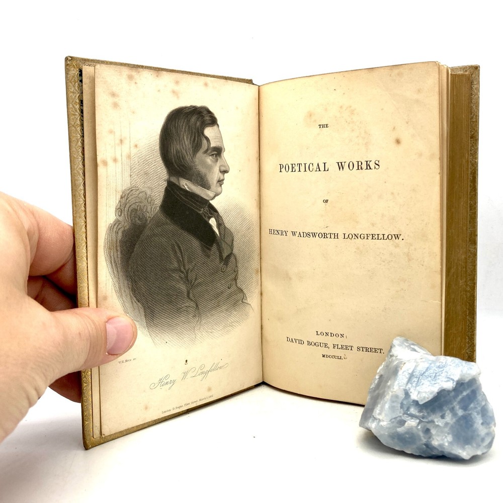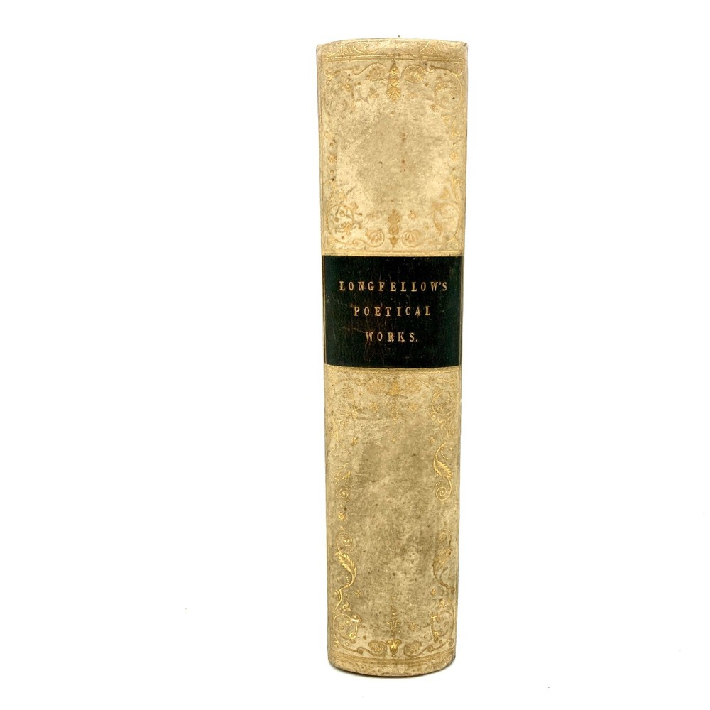 "The Poetical Works of Henry Wadsworth Longfellow" [David Bogue, 1851]. Bought in white calf by Smyth & Co of Liverpool. Gilt borders on front back cover, dentelles inside, tooling on spine, and black spine label. Marbled papers. All edges gilt. One free endpaper removed, bookplate, general soiling to leather. Binding super tight and textblock very clean. Overall, Very Good.