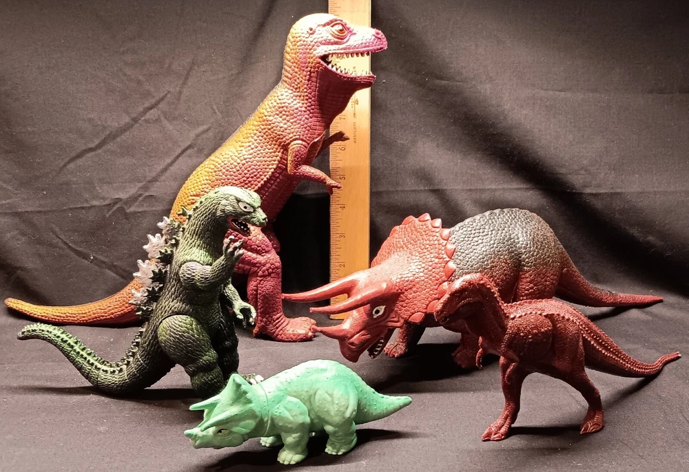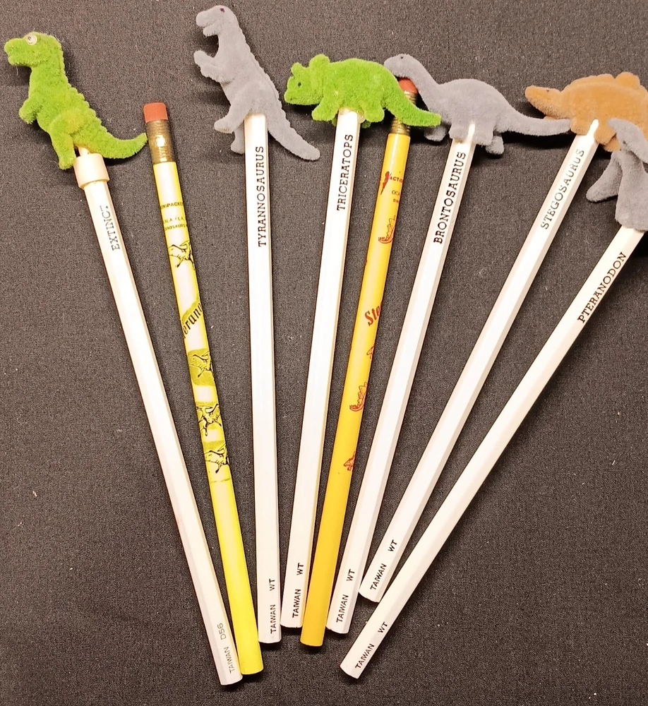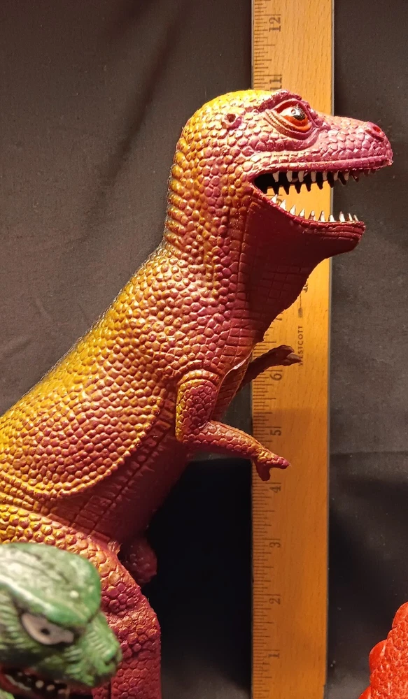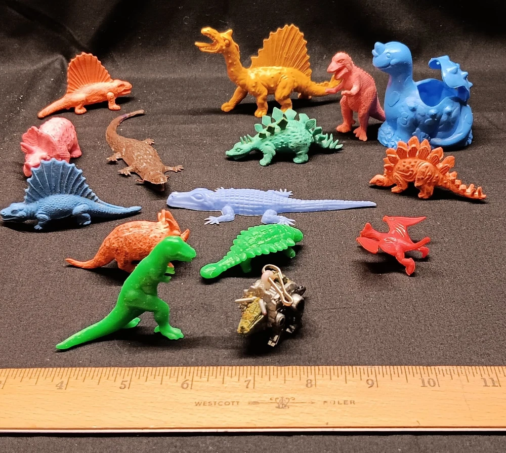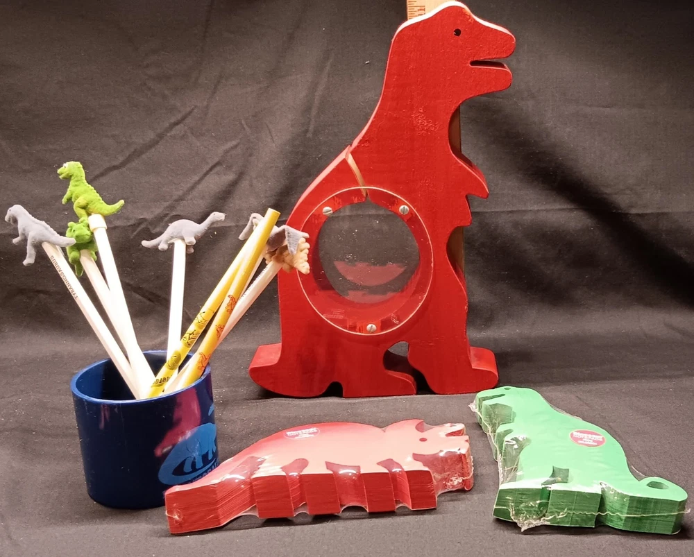 This is a fun and educational mixed lot of various dinosaur collectibles for that lucky young dinosaur enthusiast in your life. Consisting of: 6 large vinyl/hard rubber various dinosaur figures, the largest measuring almost 11" tall and includes a TOHO Godzilla figure 15 smaller soft rubber dinosaur/reptile figures, the largest measuring 2" tall and 5" wide 8 new unused dinosaur themed pencils with a dinosaur name on each, most topped with a mini dinosaur figure 1 dinosaur themed mug featuring a blue Brontosaurus (mug has a crack and not good for liquids but great as a pencil holder) 2 new unopened dinosaur shaped notepads each in a different color and dinosaur type 1 custom made dinosaur bank that can be filled with change or used as a desk accessory slotted paper holder/paper weight 1 fabulous wooden dinosaur skeleton puzzle measuring 10 1/2" tall and 19" long The puzzle will be shipped disassembled for postage saving but all the parts are numbered and is somewhat easy to reassemble in the correct order (see detail photos). A very unique assortment of dinosaur goodies!! We pack very securely and ship fast! Track Page Views With Auctiva's Counter