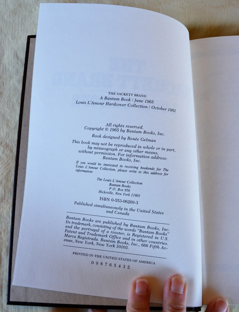 Leatherette Bound Louis L'Amour Collection: The Sackett Brand , by Louis L'Amour. ISBN: 0-553-06209-3 Bantam Books. c.1981 October. Printed in the United States. 130 pages. Very Good Condition, overall. Clean pages. No stains. Binding is intact. No torn or missing pages. No odors. No writing. The only issue is a red dot along the pages edge at the bottom – see last photo. Please see all photos. I will ship via USPS Media Mail in the USA. I will pack with tissue and cardboard to ensure safe delivery. I ship daily. I combine shipping. I refund excess shipping paid. Lg Gray Gray Book Bin 05/2022 Welcome to charmar97CharmarsCupboard! Please bid & buy with confidence. We pack with care and ship promptly from our smoke free and cat free home in zip code 88310 New Mexico . We ship daily. Please email me with any questions. I respond promptly. Please view our eBay Store. We have New, Gently Used, Vintage and Antique items. I add new items weekly, if not daily. I leave feedback immediately upon receipt of payment. I know buyers and sellers alike cherish feedback. Thank you for viewing and considering this item. ENJOY!