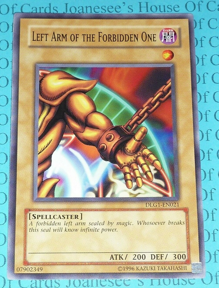 This is the Common Dark Spellcaster Left Arm of the Forbidden One 1 Stars ATK/200 DEF/300 Card text: A forbidden left arm sealed by magic. Whosoever breaks this seal will know infinite power. DLG1-EN021 Unlimited Edition English Near Mint/Mint Condition Totally Original Konami (or your money back!) I will deliver in safe packaging to keep it in perfect condition. Ideal for players and collectors alike. Check out my other items! I will combine postage costs for multiple purchases. Sign up for my email newsletters by adding my eBay Shop to your favourites Paypal payment preferred - Will attempt to post within 24hrs of payment Personal cheques and postal orders from U.K. bidders are also permitted but will have to wait until they are cleared before shipping takes place. All International purchases need to be paid by Paypal only. (No Bank Transfer)