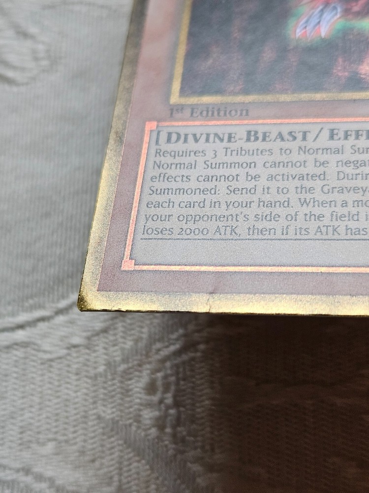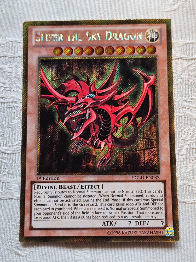 Slifer the Sky Dragon card from the Yugioh TCG.One of the three God cards. This card is in Lightly played condition. Overall good condition-- however it has a small indent (photo 2) in the effect area and a small crease on the lower left part of the card (photo 3) overall still looks good. Shipped in a sleeve inside a toploader (hard plastic case) inside a standard envelop with Ebay Standard Envelope Service. See my other listings for more Yugioh cards!
