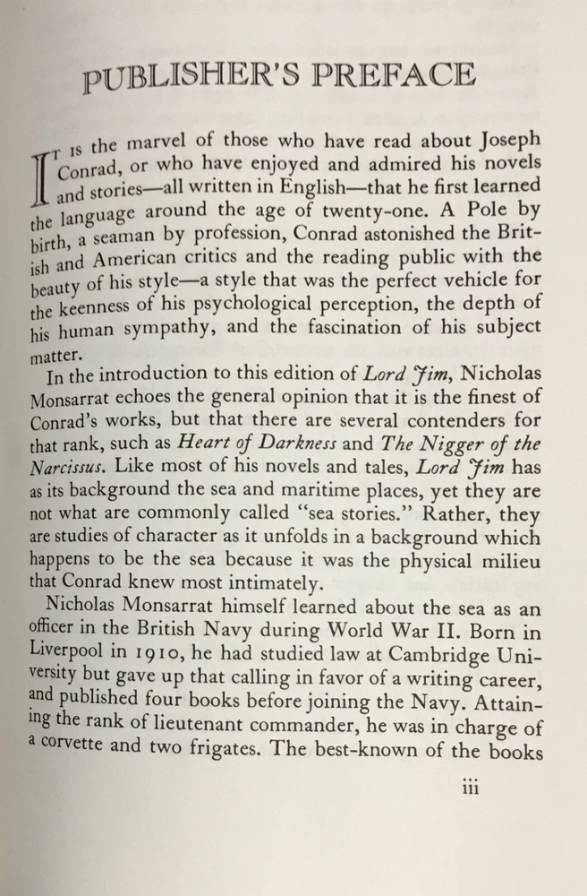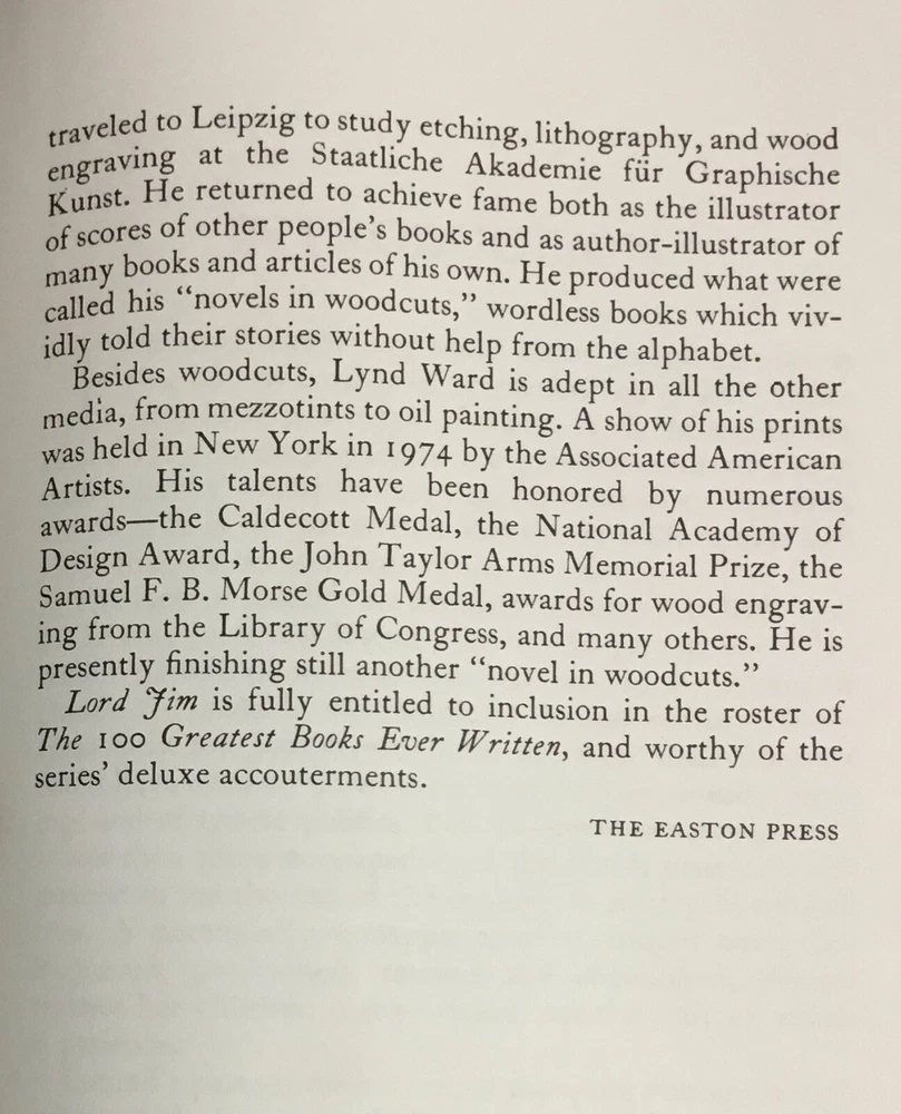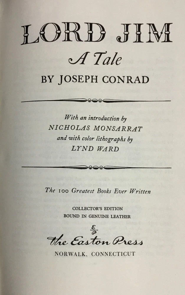Please be sure to have a look at photos and condition description before deciding to buy. This is a used book with some wear and tear, which we've tried to thoroughly catalog. If there are any questions we've failed to answer here, please feel free to reach out to us. Book will ship within one business day of payment via USPS Priority Mail. Featured here is the title, Lord Jim , A Tale by Joseph Conrad. With an introduction by Nicholas Monsarrat and with color lithographs by Lynd Ward. The 100 Greatest Books Ever Written. Collector’s Edition, bound in genuine leather. The Easton Press. Norwalk, Connecticut: Lithographs copyright 1987. 407 pages. Illustrated. Printed in the United States of America. Book will ship with Easton Press mailing box! Please have a look at photos/seller's notes for all the details. Thanks for visiting, and have a beautiful day! shelf-10