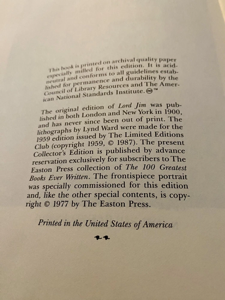 This is a must-have for any literature and fiction collector. The Easton Press Collectors Edition of Lord Jim by Joseph Conrad is a stunning work of art. The binding is made of high-quality leather that feels amazing to the touch. The book features a 1st edition special attribute and is in excellent condition. The language used in the writing is English, making it accessible for many readers. The book has not been modified in any way and does not include any personalized content. This edition is a rare find and a treasure for any book collector.