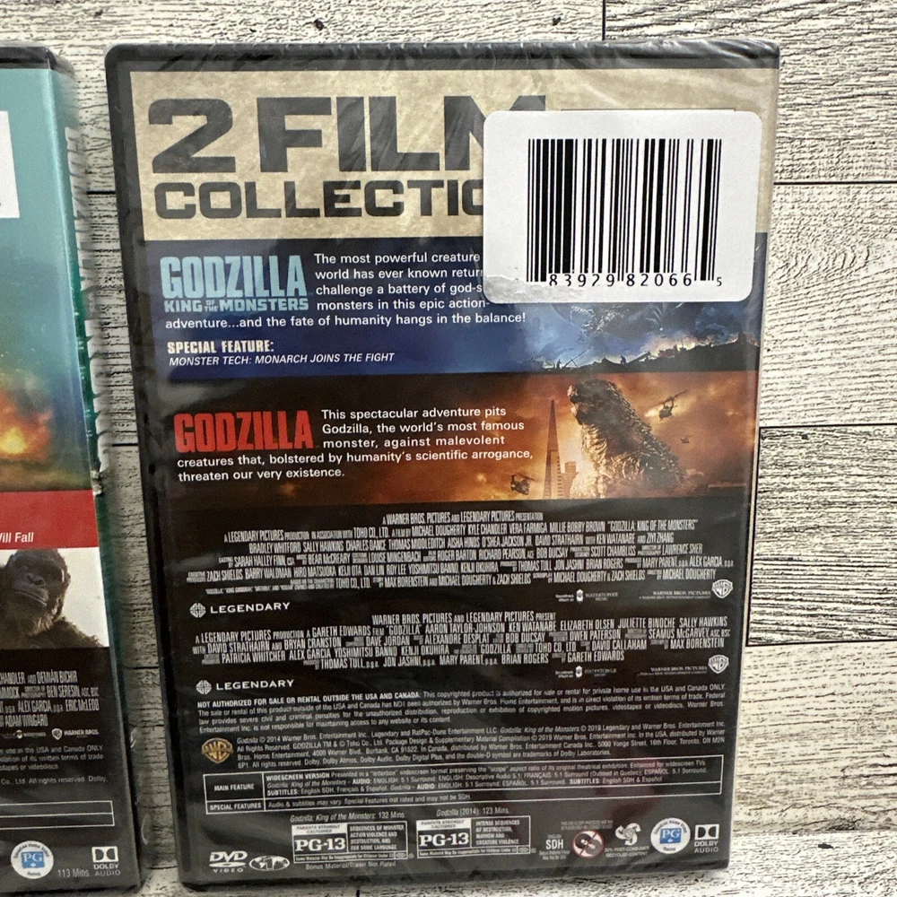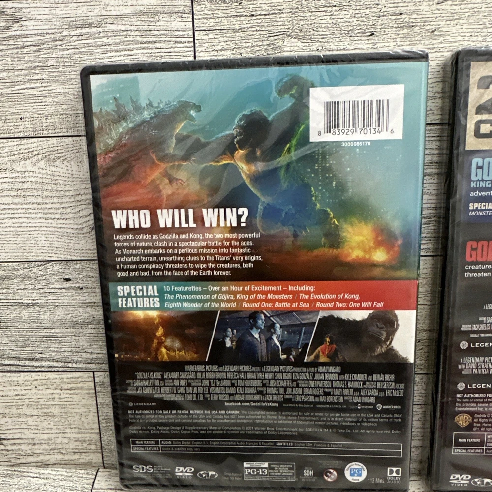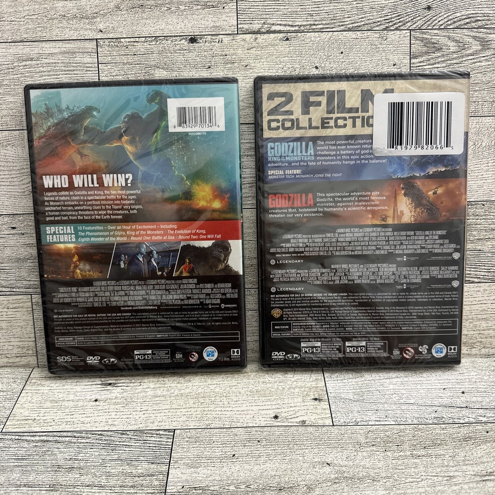 This product is a lot of two DVDs, including the "Godzilla 2 Film Collection", Godzilla King of the Monsters and Godzilla plus, the newly released "Godzilla Vs. Kong" movie. The DVDs are in tall/DVD case format and have a PG-13 rating. They include English, French, and Spanish subtitles and belong to the science fiction and horror sub-genres. The DVDs are produced by Warner Home Video and come in a special edition. They feature additional scenes and have a total run time of 113 minutes. The DVDs are region code 1 and have English language audio.