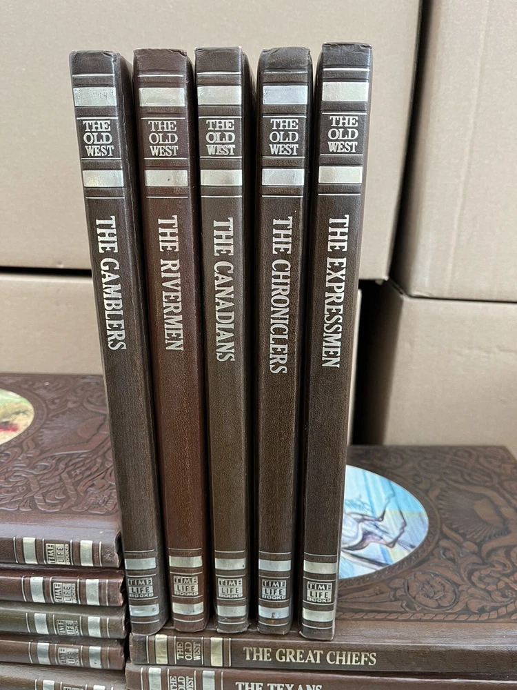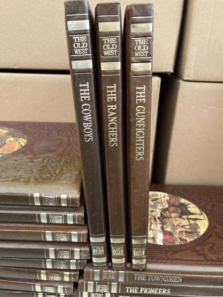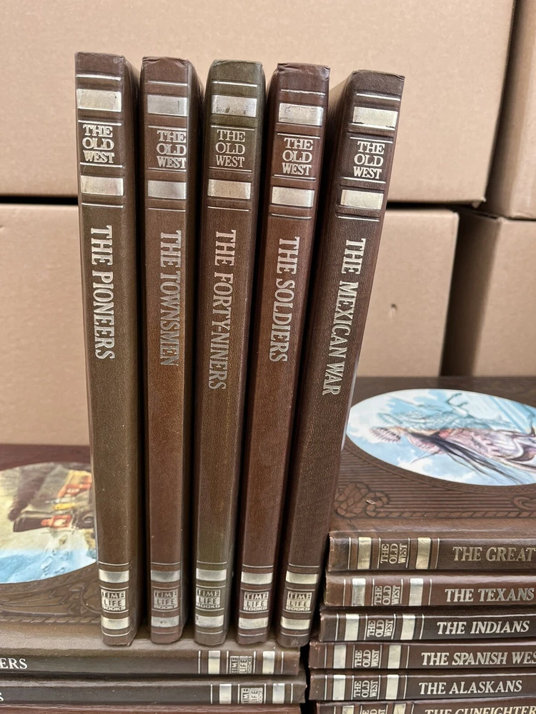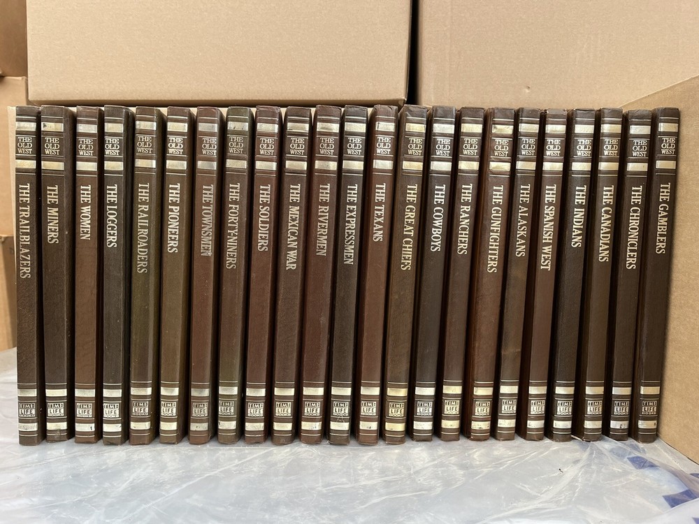 Selling vintage lots of 23 books plus poster. Books included in the listing are shown in photos. The Cowboys The Indians The Trailblazers The Soldiers The Railroaders The Forty-Niners The Pioneers The Gunfighters ( with poster) The Expressmen The Townsmen The Great Chiefs The Rivermen The Texans The Loggers The Chroniclers The Spanish West The Miners The Canadians The Alaskans The Ranchers The Mexican War The Women The Gamblers The books are in very good to good condition. It also includes an original poster that came with the Gunfighter book. Some books have discoloration on the cover due to sunlight exposure during storage and one book has a small scuff. ( as seen in pictures).
