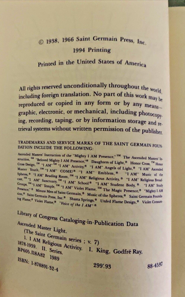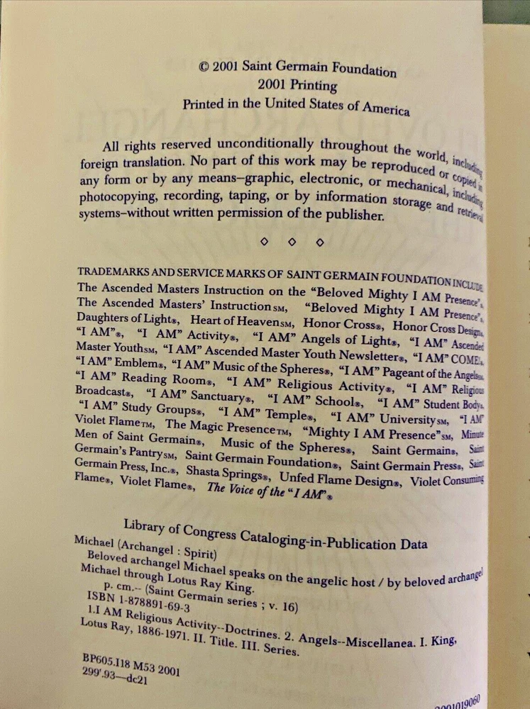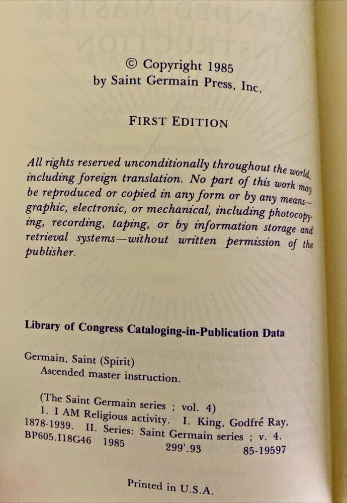 Lot of 3 Ascended Master Saint Germain Press Series Instruction, Light, Michael Included: Ascended Master Instruction (1985, First Edition) has about 12 pages with highlighting, see pics Ascended Master Light (1994) price written in pencil on first page, other pages clean, see pics Beloved Archangel Michael Speaks on the Angelic Host (2001) price written in pencil on first page, has 2 pages with underlining in pencil, see pics Books have slight corner wear, see pics Free shipping!