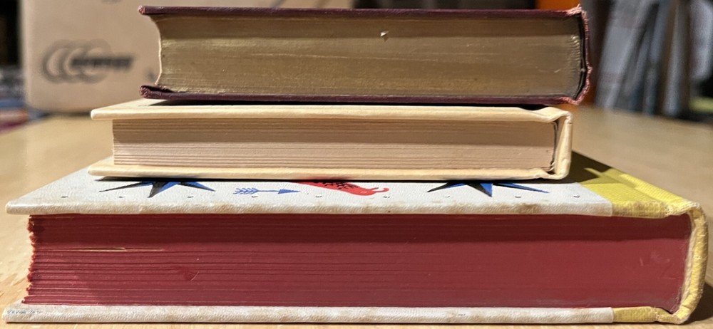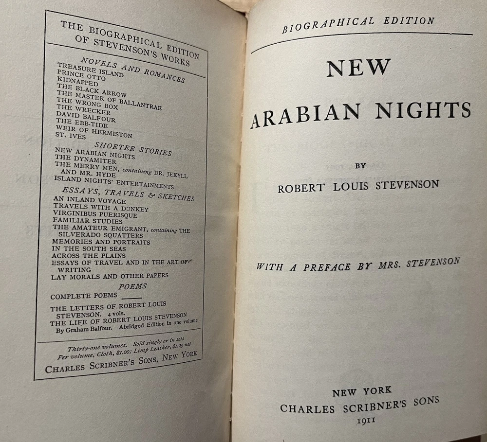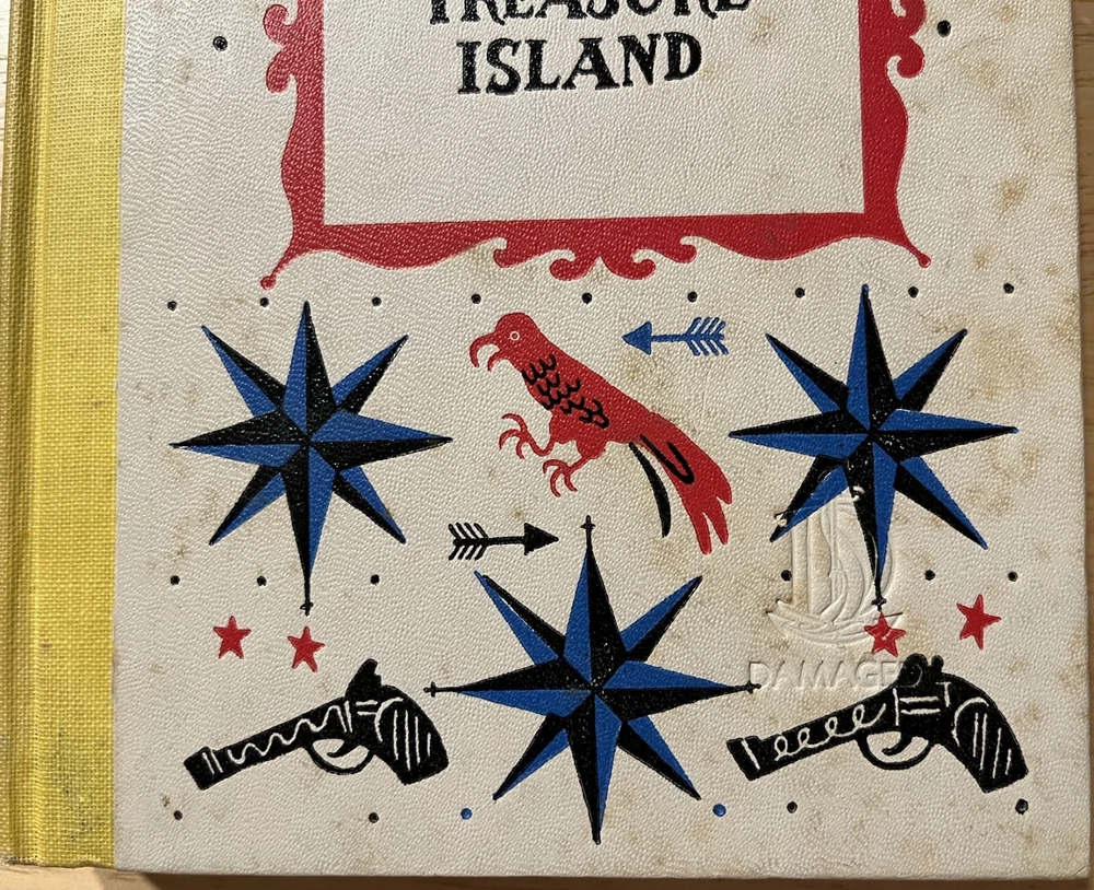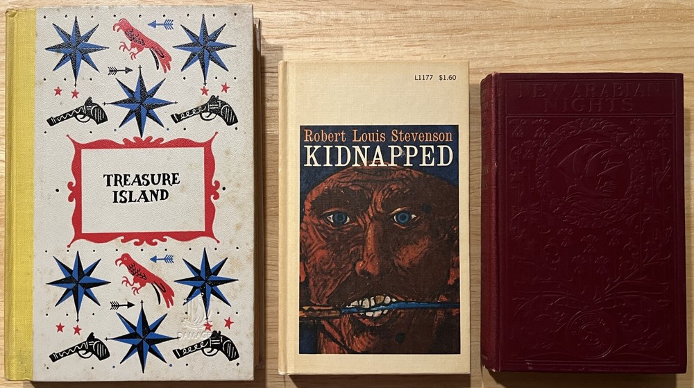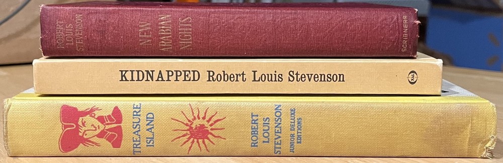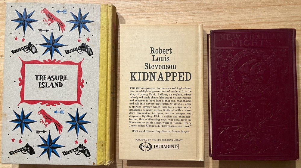 This lot contains three books by Robert Louis Stevenson. All are vintage hardcovers without dust jackets whose pages have yellowed with age. All are in very good condition for their age, with tight bindings and clean pages. See pictures for any condition issues. The titles in this lot include: New Arabian Nights: Printed 1911, Biographical Edition; beautiful, heavy embossing on both front & back cover; spine is faded; top outer page edges are gold/gilt; rubbing wear on spine edges; binding cracked at the back but no pages are loose or missing (see picture); stains on outer page edges; Kidnapped: First Printing 1959; very little shelf wear on cover; small, lightly penciled notation on inside front hardboard; Treasure Island: Printed 1954; inked name on flyleaf; stains on outer page edges and hardboard covers; illustrated end papers; spine bottom is damaged (see photo). The front bottom corner has an embossed emblem and the word "DAMAGED" (see last photo). No visible marks, stains, tears or creases other than noted. Smoke-free home.