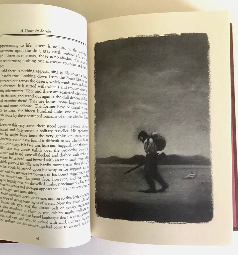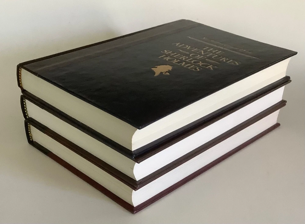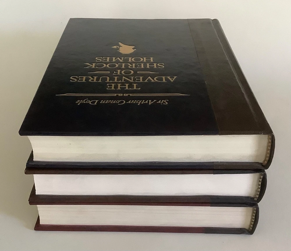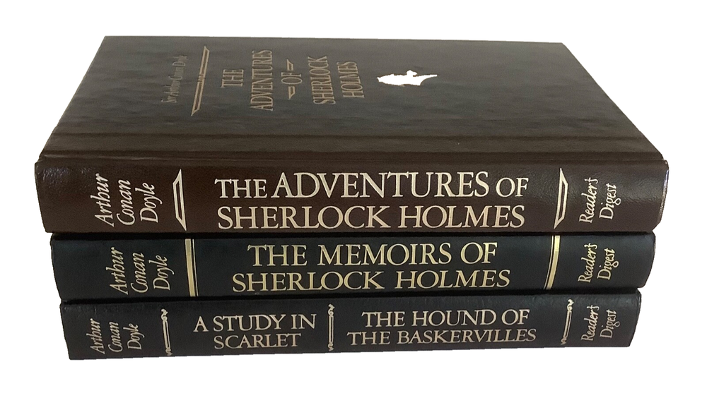 Lot of 3 Sherlock Holmes deluxe illustrated hardcover books by Sir Arthur Conan Doyle: The Adventures of Sherlock Holmes, The Memoirs of Sherlock Holmes, and two novels in one A Study in Scarlet / The Hound of the Baskervilles. All books are in very good condition. Issued by the Reader’s Digest Association as part of their The World’s Best Reading series, two of the book include the publisher’s notes (Adventures and Memoirs). Covers and spines are solid and tight; faux leather spines and marbled covers have gilt lettering and impressions. There is light edge and corner handling wear. The Adventures has a scuff and small mark on the back cover, Study in Scarlett has a small rub at the base of the front cover. There is a book plate inside the front of A Study in Scarlett. No writing found inside the books. See photos. Shipped with USPS Media Mail.