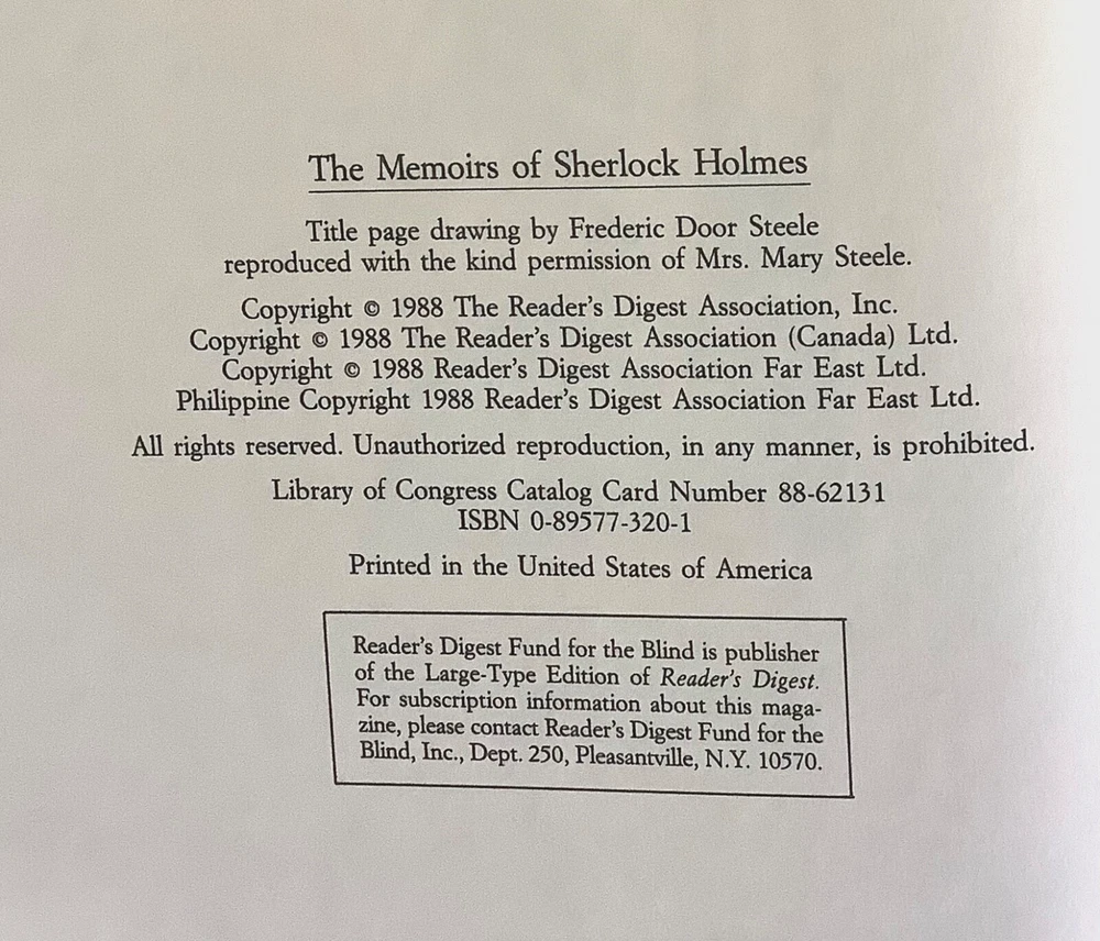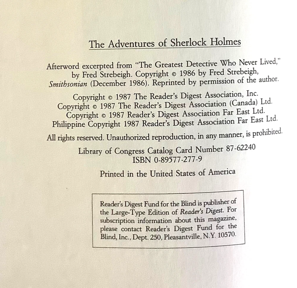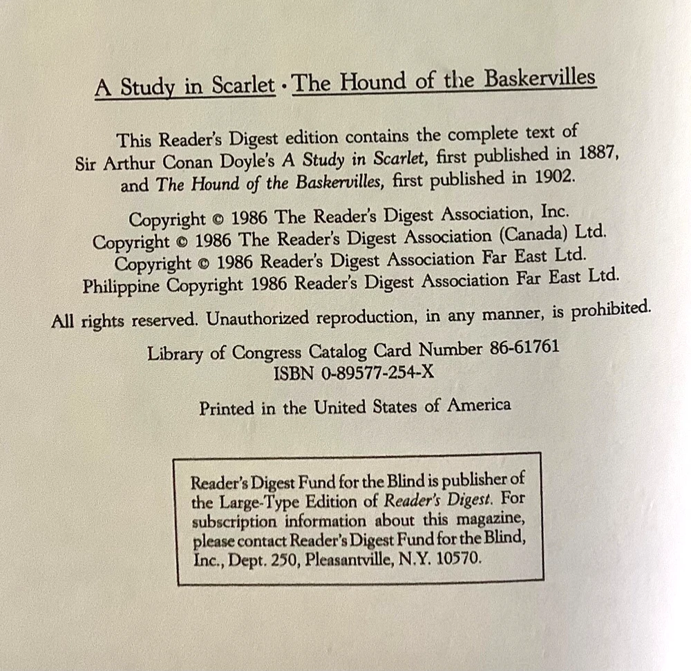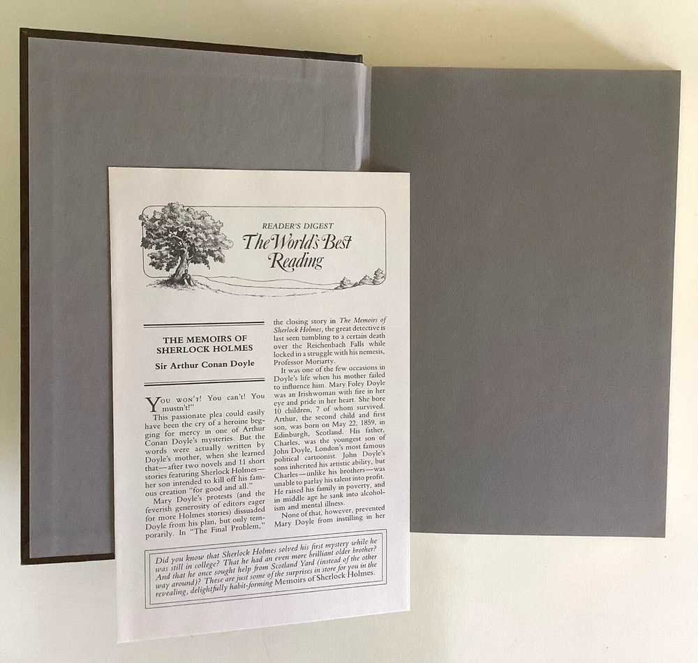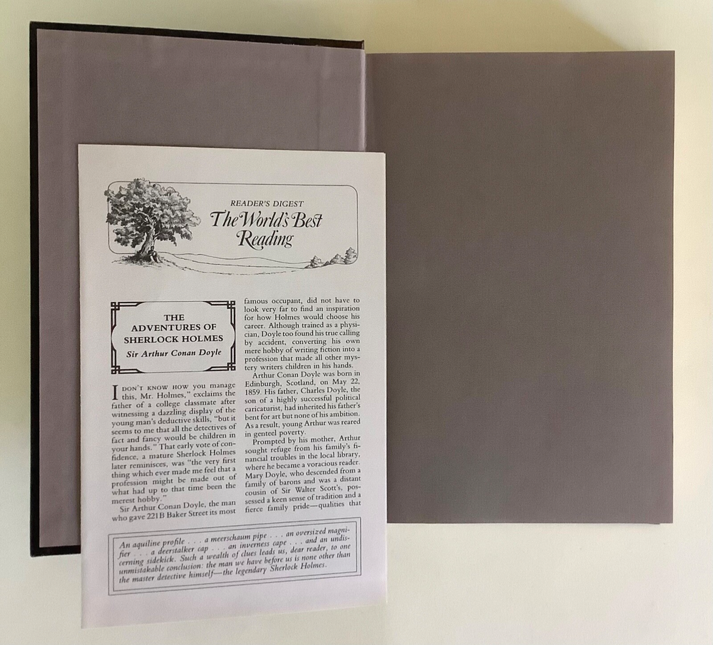 This set is a must-have for any Sherlock Holmes fan! The hardcovers are beautifully designed with faux leather spines and marbled covers, giving them a classic, elegant look. The books are in excellent condition, with tight bindings and crisp pages. The inclusion of both short stories and full novels makes it perfect for diving into Holmes’ world. The Reader’s Digest editions add nice historical context with publisher’s notes. A fantastic collector’s piece that’s also great for reading—highly recommended!