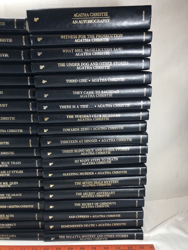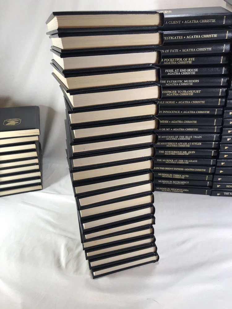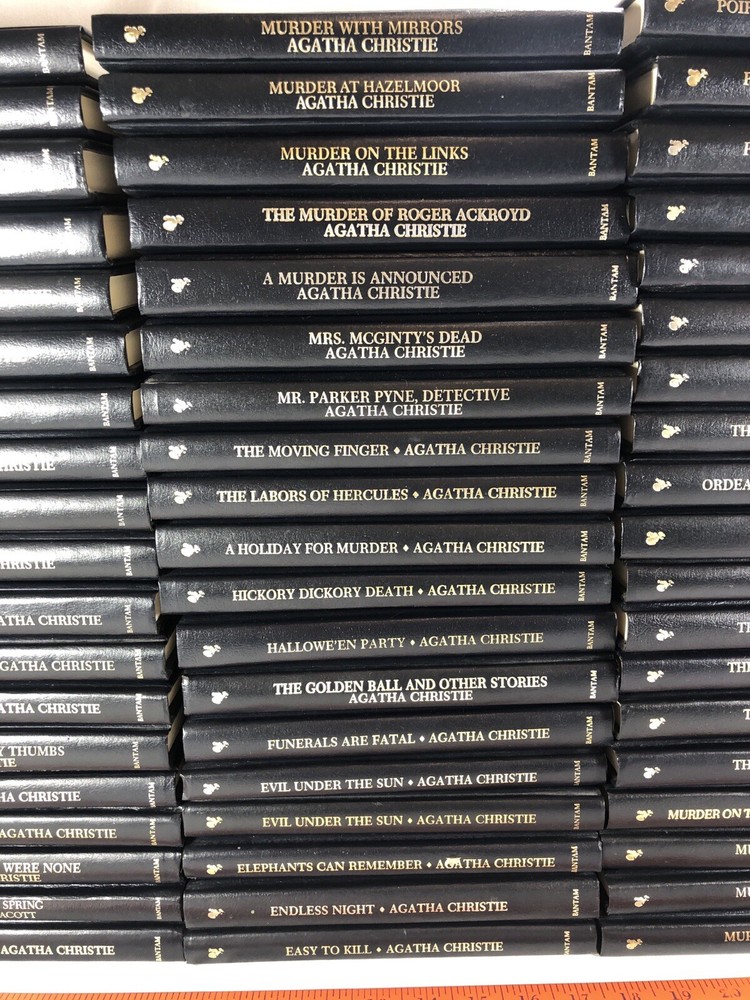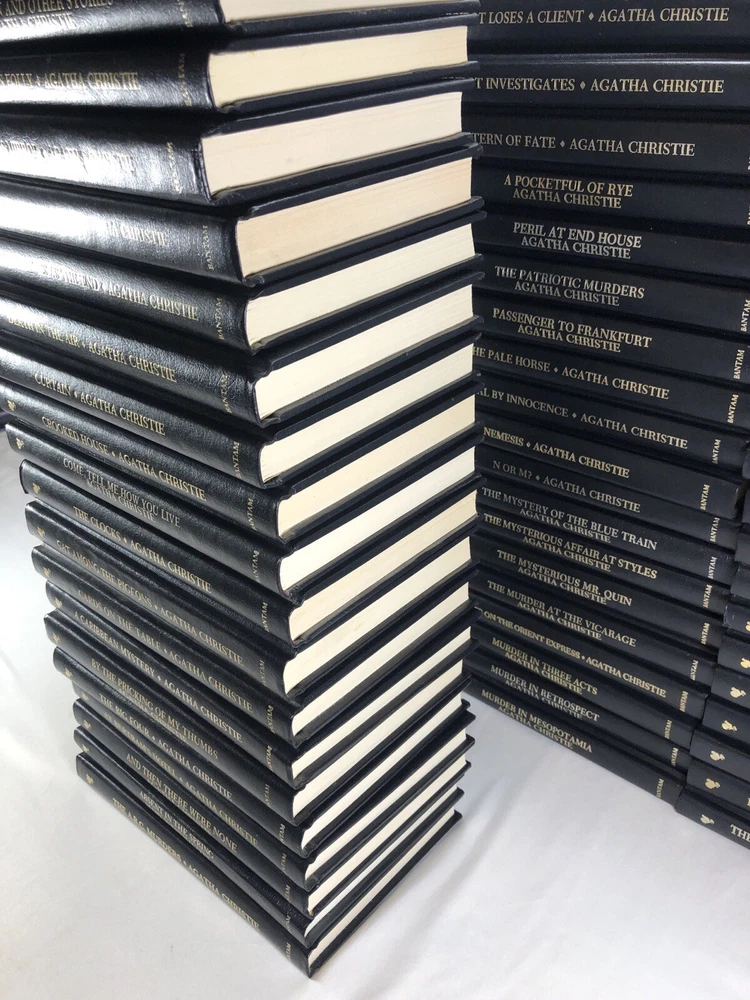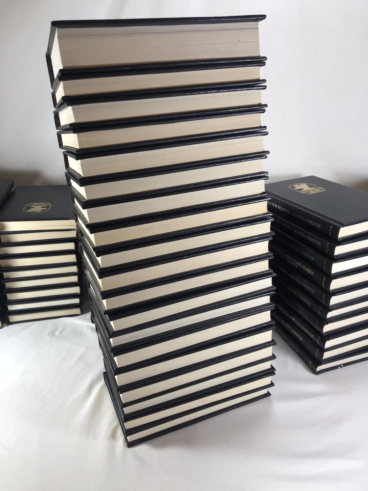 This is a lot of 76 Agatha Christie mystery collection hard cover books. They have a very dark blue leatherette cover with gold lettering. The books are in excellent condition, suitable for gift giving. There are no marks inside, no writing, nameplates, or folded pages. These books were stored very well, and do not have any off odors, such as a moldy smell. It looks as though the books really have never been read when opening them up. The titles are mostly in alphabetical order to easily see everything that is included in the first few photos. There are some rare titles. Note that there are two copies of the one book called evil under the sun. Included the maximum 24 photos to show the condition of the books, which again are in excellent condition. Each book weighs approximately 1 pound. Total shipping weight will be well over 75 pounds. The books will be packed well for protection, and shipped in two boxes. An extra handling fee has been added to help offset the shipping cost for the second package, since the eBay shipping rate can only handle one package. Books will be shipped from Connecticut, so the closer you are the less expensive shipping will be. I’ve included two different shipping options, choose whatever is best. Signature confirmation will be included if eBay requires it. LOCAL PICKUP IS AVAILABLE. LOCATED IN CT 06035 Please email with any questions.