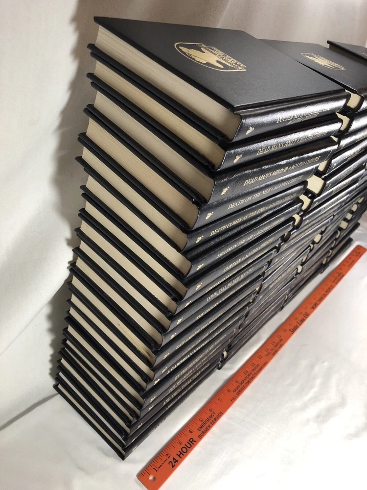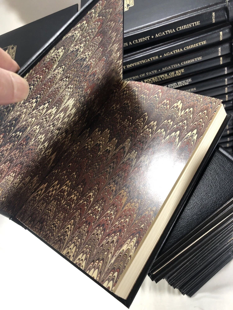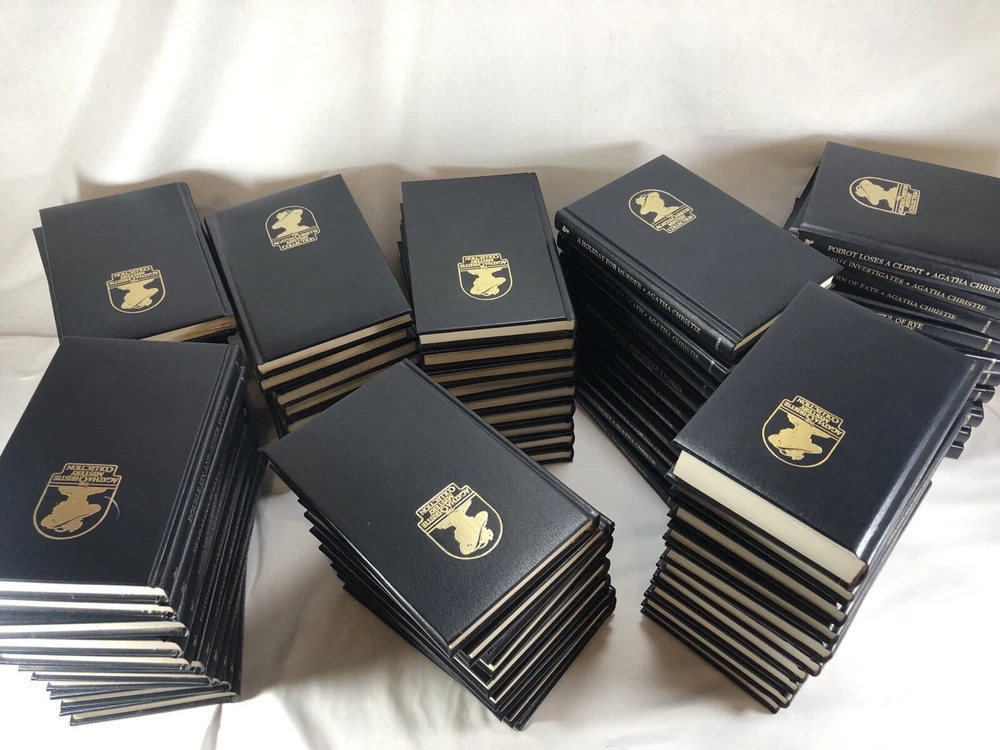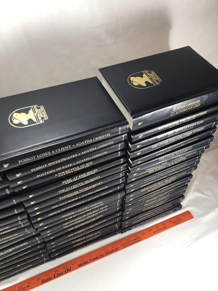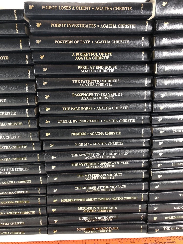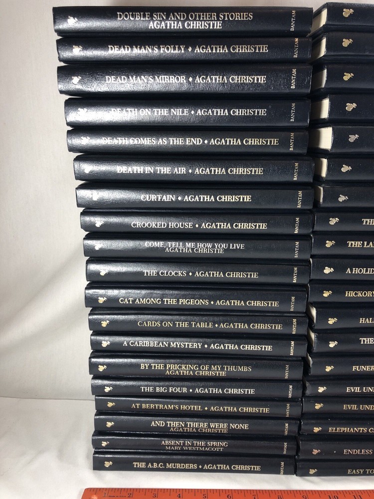 This is a lot of 76 Agatha Christie mystery collection hard cover books. They have a very dark blue leatherette cover with gold lettering. The books are in excellent condition, suitable for gift giving. There are no marks inside, no writing, nameplates, or folded pages. These books were stored very well, and do not have any off odors, such as a moldy smell. It looks as though the books really have never been read when opening them up. The titles are mostly in alphabetical order to easily see everything that is included in the first few photos. There are some rare titles. Note that there are two copies of the one book called evil under the sun. Included the maximum 24 photos to show the condition of the books, which again are in excellent condition. Each book weighs approximately 1 pound. Total shipping weight will be well over 75 pounds. The books will be packed well for protection, and shipped in two boxes. An extra handling fee has been added to help offset the shipping cost for the second package, since the eBay shipping rate can only handle one package. Books will be shipped from Connecticut, so the closer you are the less expensive shipping will be. I’ve included two different shipping options, choose whatever is best. Signature confirmation will be included if eBay requires it. LOCAL PICKUP IS AVAILABLE. LOCATED IN CT 06035 Please email with any questions.