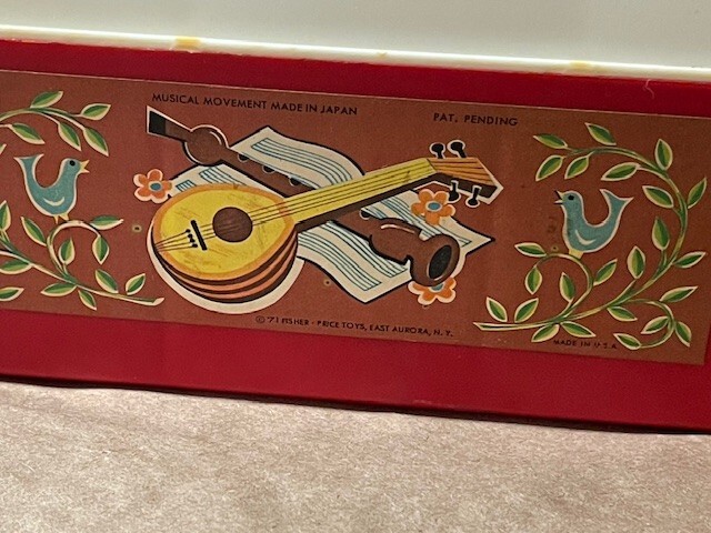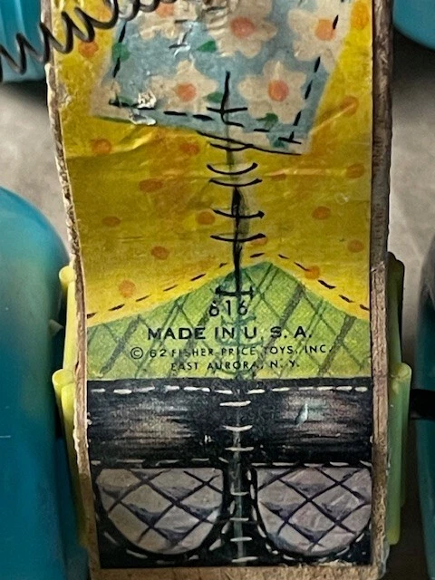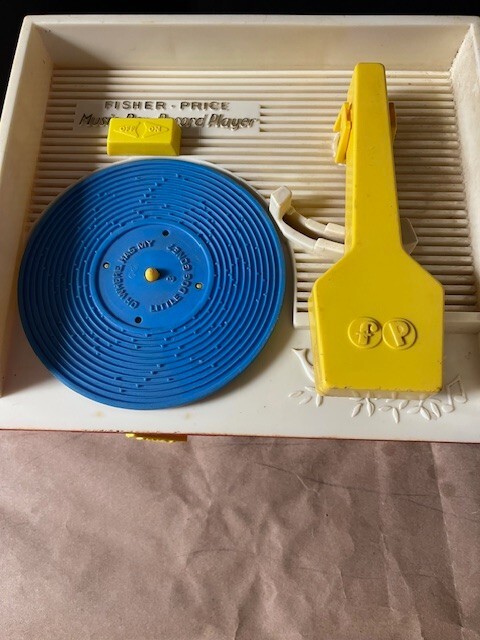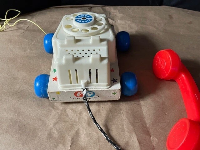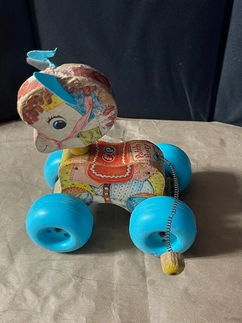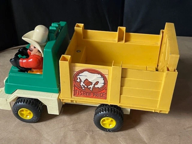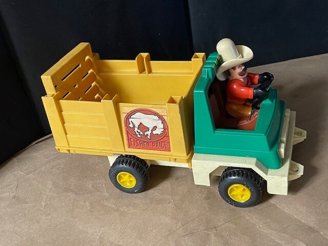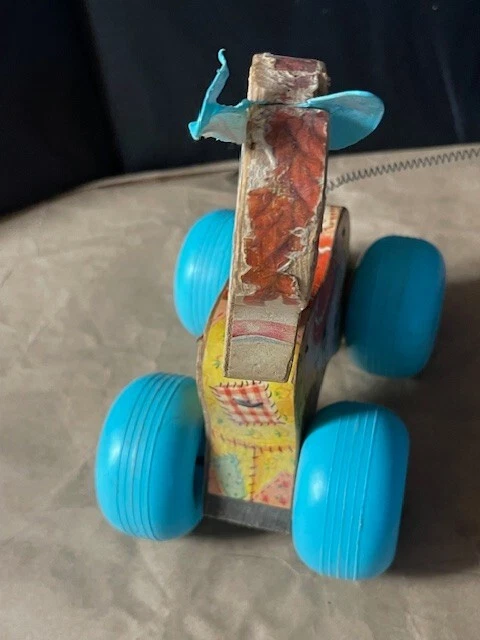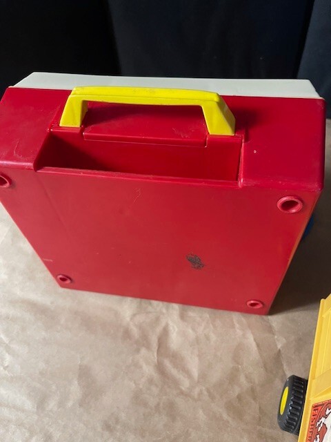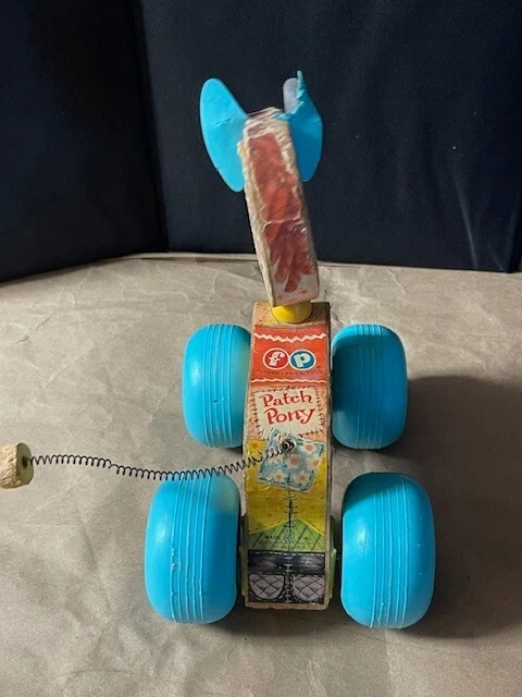 Lot of Vintage Fisher Price Toys record player, radio, phone, pony, truck record player #995 has 1 record-Oh Where Has My Little Dog gone/London Bridge 1971 radio-#795 wind up Plays Toyland 1983 phone #747 pull toy eyes move up and down, some wearing of string and wood corners 1961 patch pony #616 pull toy, makes "clacking" noice, see condition description 1962 truck-#330 rodeo rig, no horse 1979 all items could use some cleaning if so desired.