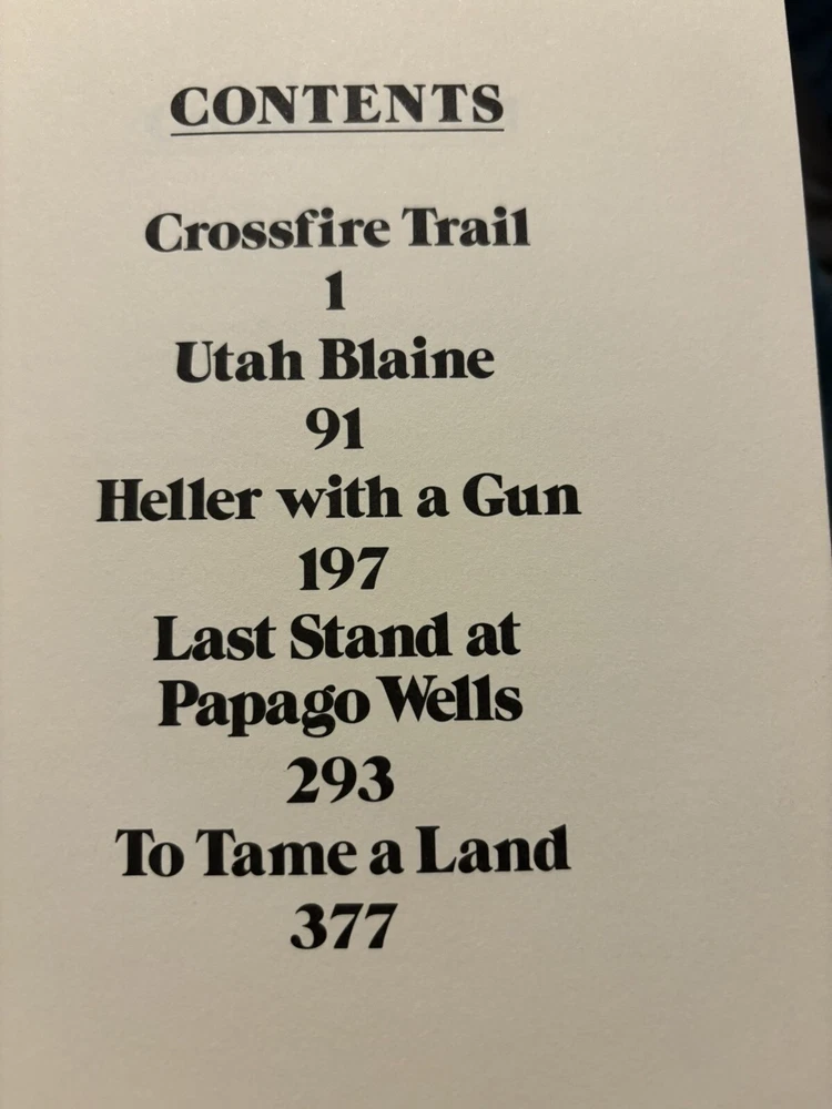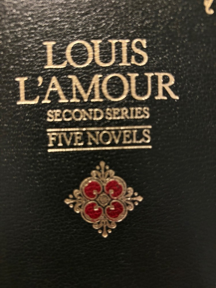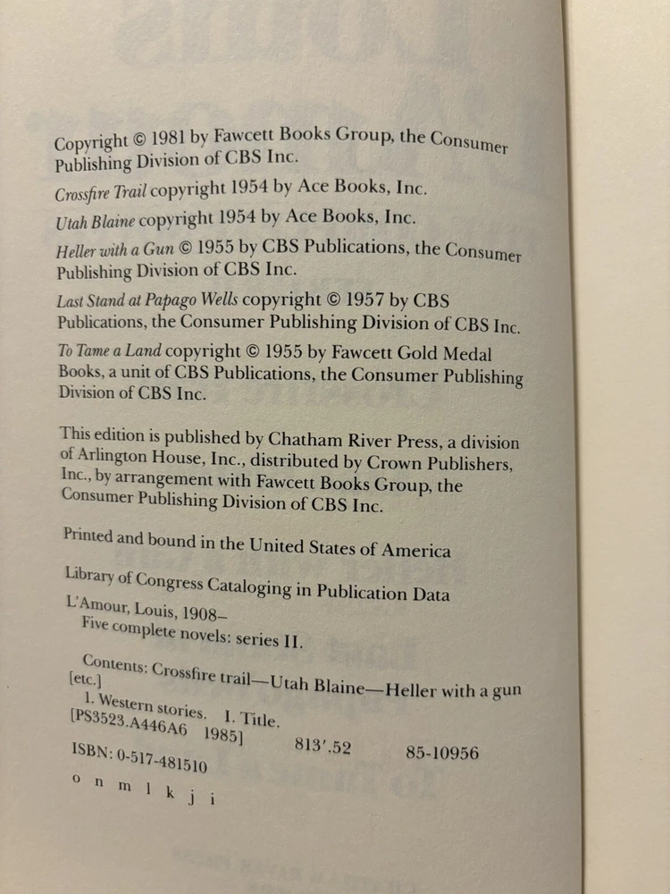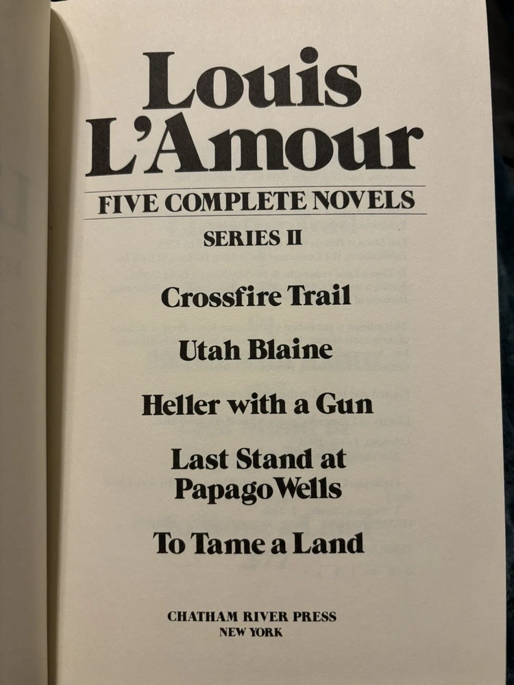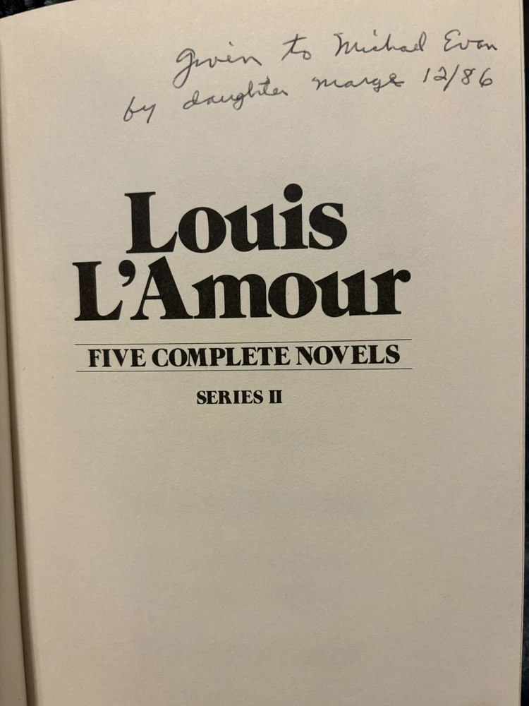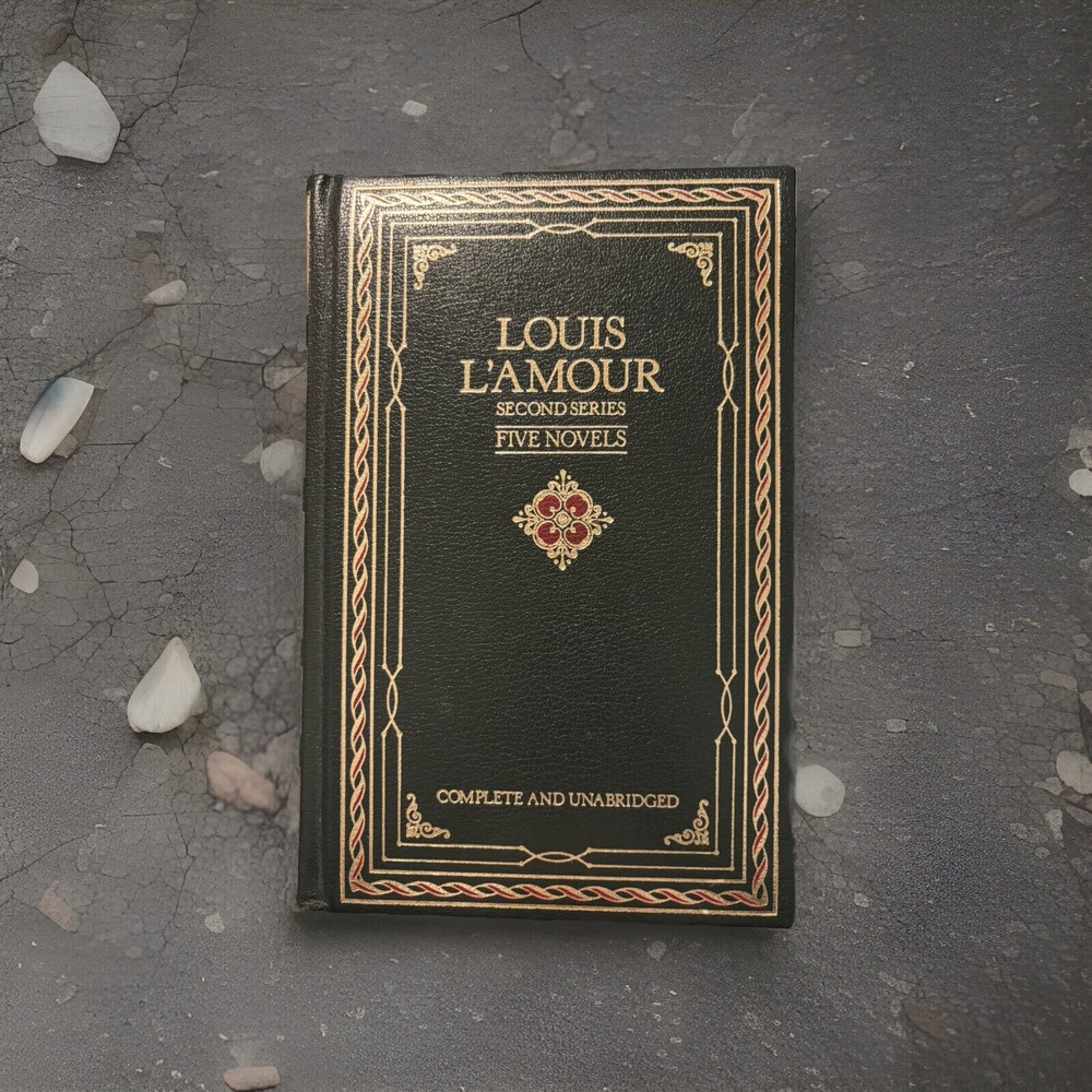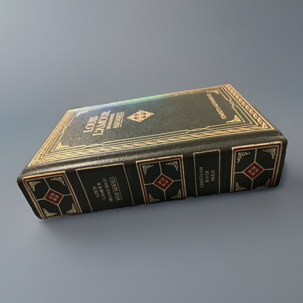 This is a rare and vintage hardcover edition of Louis L'Amour's Five Complete Novels Series II, published in 1981 by Chatham River Press. The book is leather bound and unabridged, weighing 20 oz. It features five classic Western novels from the Louis L'Amour book series, written in English and set in the 1980s. The book is in excellent shape. Inscription inside cover (see photo). Would make a great addition to any collection or library. (#3) EE