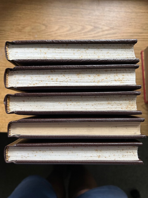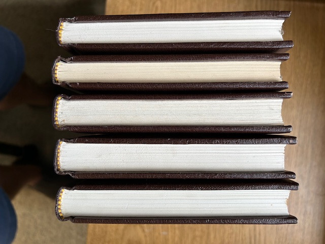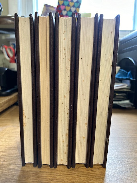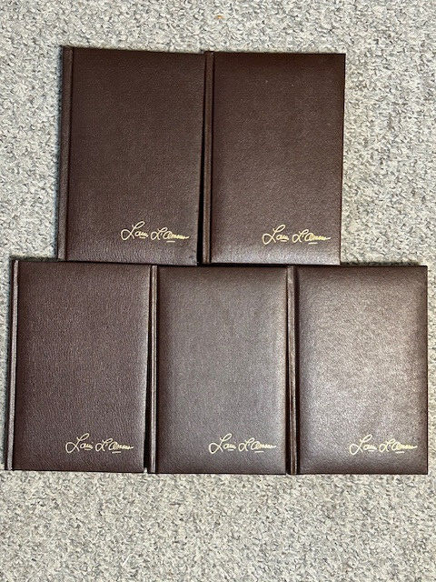 5 Louis L’Amour Novels: Lando - 1982 Flint – 1981 The Daybreakers - 1981 Silver Canyon - 1981 Sackett - 1981 Bantam Publishing. “Leatherette” hardcover. In overall excellent condition with the following exception. There is some “drip” discoloration on the top and side edged of the pages. Unknown etiology. No visible damage/leaching noted on any pages. Smoke free. It appears that these books may never have been opened! One has an ownership label inside; one other has the owners name written inside. PLEASE LOOK AT THE PICS, AND FEEL FREE TO ASK FOR MORE!! They’ll be gorgeous on your shelf! Free shipping in US.
