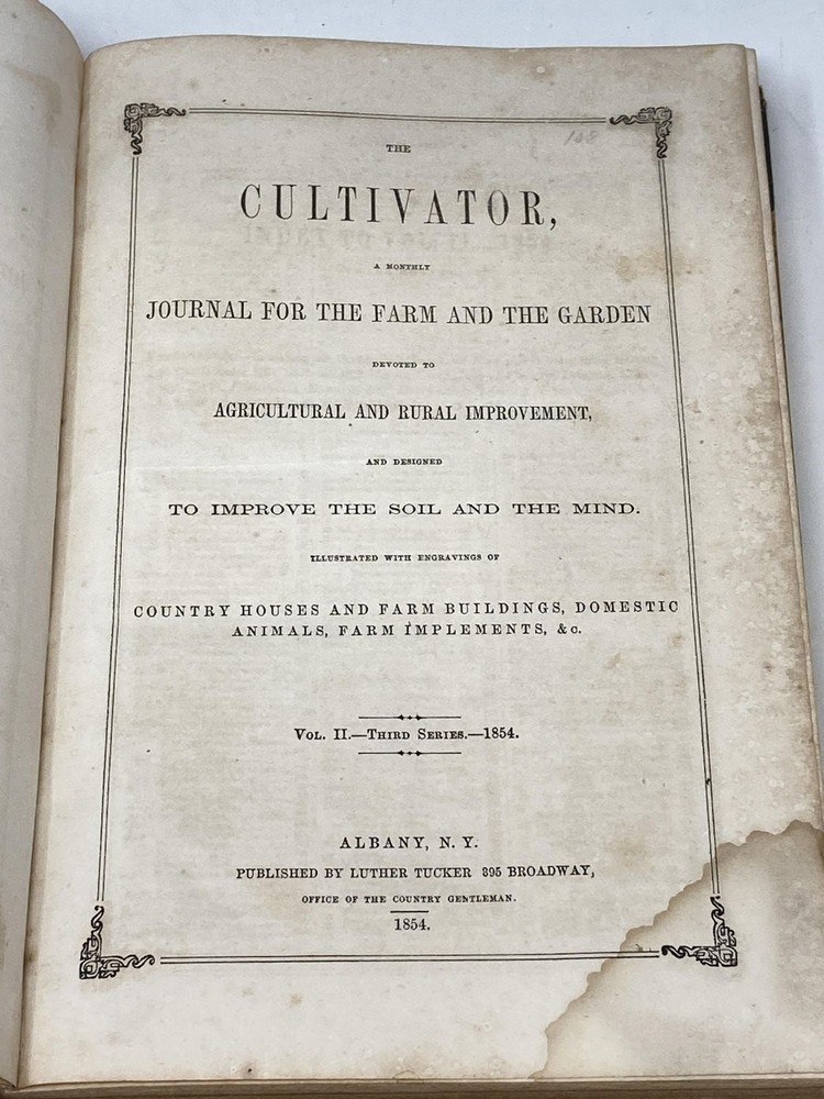 THE CULTIVATOR, VOLUME II - THIRD SERIES [1854], NUMBERS 1-12 [JANUARY - DECEMBER]; A Monthly Journal Devoted to Agriculture, Horticulture, Floriculture and to Domestic and Rural Economy. Illustrated with Engrvings of Farm Houses and FArm Buildings, Impproved Breeds of Cattle, Horses, Sheep, Swine and Poultry, Farm Implements, Domestic Utensils, &c Author: Tucker, Luther (Publ.) Title: THE CULTIVATOR, VOLUME II - THIRD SERIES [1854], NUMBERS 1-12 [JANUARY - DECEMBER]; A Monthly Journal Devoted to Agriculture, Horticulture, Floriculture and to Domestic and Rural Economy. Illustrated with Engrvings of Farm Houses and FArm Buildings, Impproved Breeds of Cattle, Horses, Sheep, Swine and Poultry, Farm Implements, Domestic Utensils, &c Publication: Albany, NY: Luther Tucker, from the Steam Press of C. Van Benthuysen, 1854 Description: Leather-bound. Twelve issues bound together, with index to the front. Quarto, 10.5 in. x 7 in. Continuous pagination: pp. 384. Half calf over marbled boards. Gilt title and double bandlines to spine. Rubbing to edges with corners just showing. Tidelines and bent page-corners to preliminary pages. Tanning and light foxing to pages. Spine and hinges tight. Good. "The Cultivator", whose motto was "To Improve the Soil and the MInd", was a monthly journal published from 1834 to 1865 that was dedicated to strengthening farm techniques. Seller ID: 88107 Subject: Agriculture Aardvark Rare Books Eugene, OR We work hard to make your Bookbuying Experience safe, easy and fun. Aardvark Books is a proud member of the ABAA (Antiquarian Booksellers Association of America) and IOBA, Independent Online Booksellers Association. Ezra is also an accredited and Qualified Appraiser of Books and Manuscripts, with a designation from the ASA (American Society of Appraisers), with considerable Archive experience as well. Shipping All books shipped to US destinations are sent via the US Postal Service. Faster shipping is available, please ask before paying. We will combine shipping on items purchased at the same time in order to help reduce costs. International shipping is also available. Please inquire for a shipping quote before ordering. This listing was created by Bibliopolis.