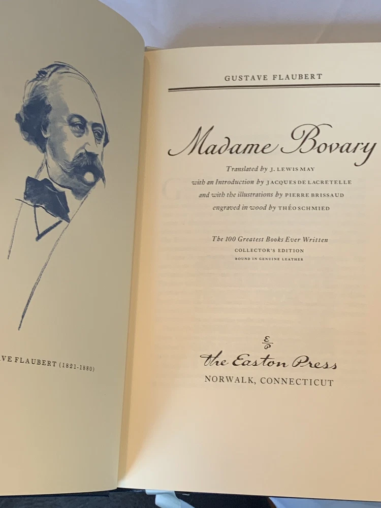 Excellent preowned condition. Gold gilding has several scratches and a tiny stain. Pages are clean, and unmarked, binding is solid. This beautiful collector's edition of Gustave Flaubert's timeless classic, Madame Bovary, is bound in luxurious leather and adorned with illustrations. The pages are crisp and clean, maintaining the original feel of this original edition. The author's vivid language and poignant storytelling will transport you to 19th century France, where a young woman's longing for passion and excitement leads to her downfall. This is a must-have addition to any literature lover's collection.
