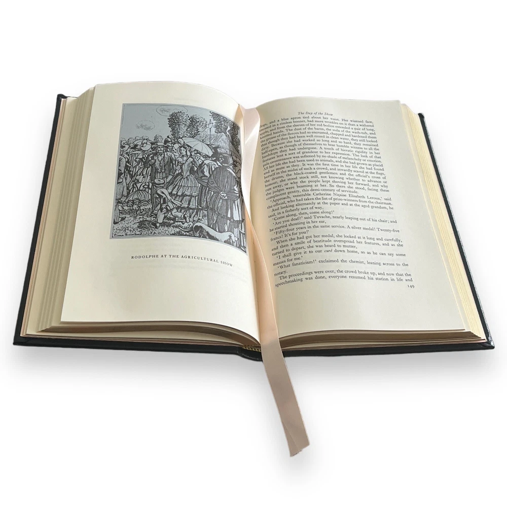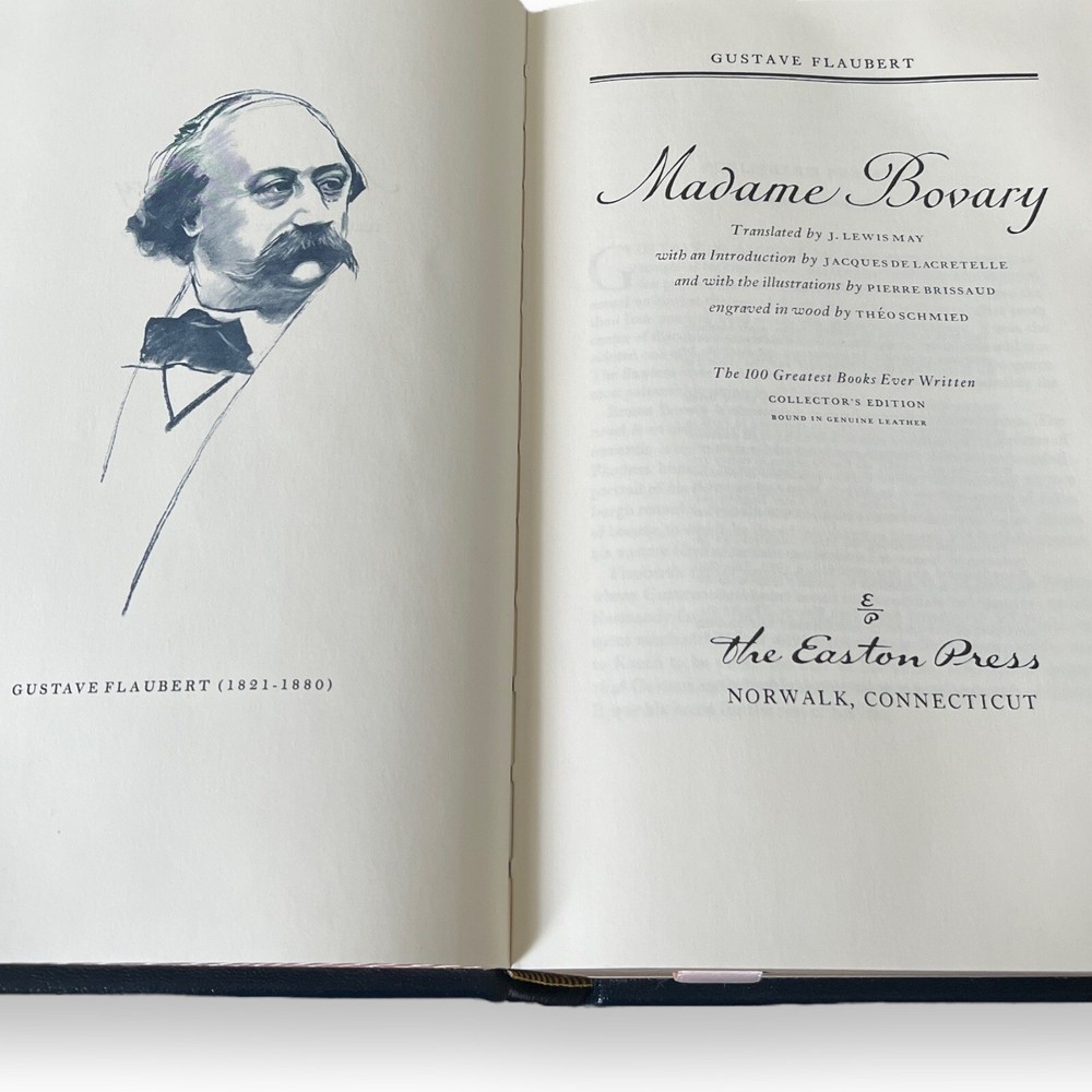 Madame Bovary by Gustave Flaubert 100 greatest books Leather Easton Press 1978 ABOUT THE BOOK: LIKE NEW CONDITION! This illustrated collectible edition is in Excellent condition. In the original faux leather boards, elaborately gilt stamped. This book has a red genuine leather cover with 22 kt. gold accents and lettering, raised spine bands, silk moire endpapers, gilt-edged pages, ribbon bookmark. Collector Edition part of the 100 Greatest Books Ever Written Series. MSRP $78 Features: The 100 Greatest Books Ever Written Publisher Easton Press, Connecticut, USA; 1978 Full Leather Hardback, Silk Moire Endpapers, Silk Ribbon Marker With Full Colour Illustrations by Pierre Brissaud Translated by J. Lewismay