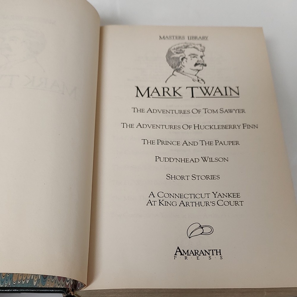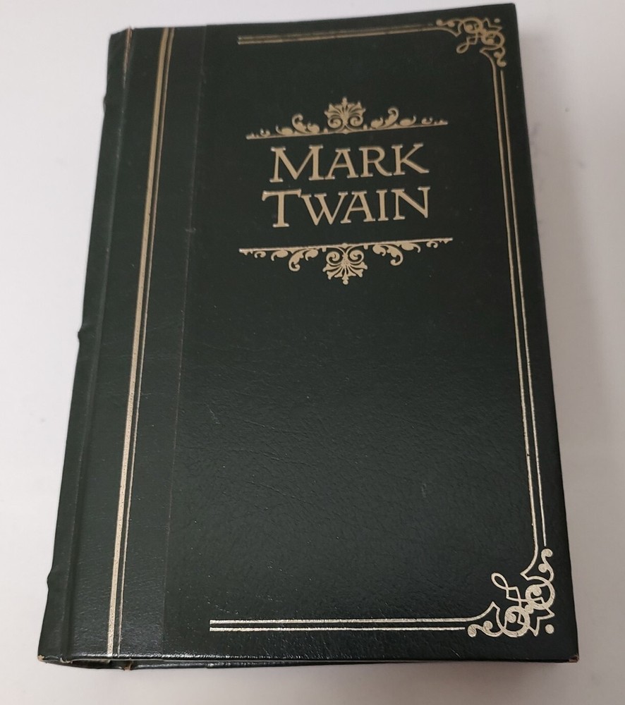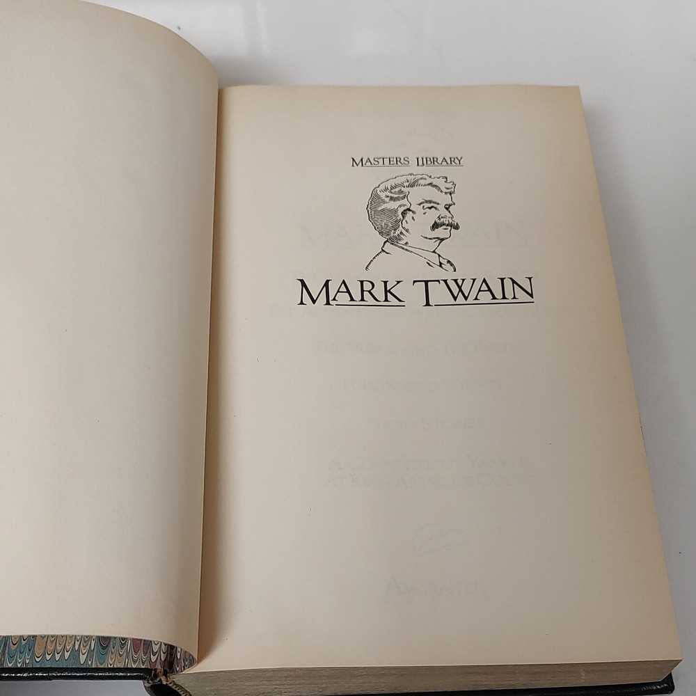 Mark Twain Master's Library 1981 Bonded Leather HC VG+ 800pp 9 stories. The inside is very good pre-owned condition.please see the photos as they are considered part of the description. The outside binding unfortunately is split half way down the front as noted in the photos and there are a couple of small nicks in the binding spine.