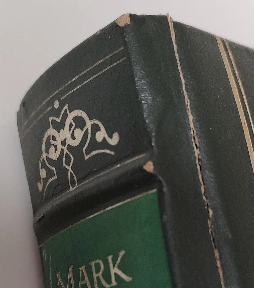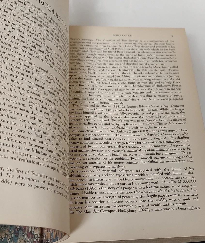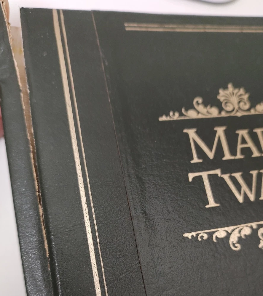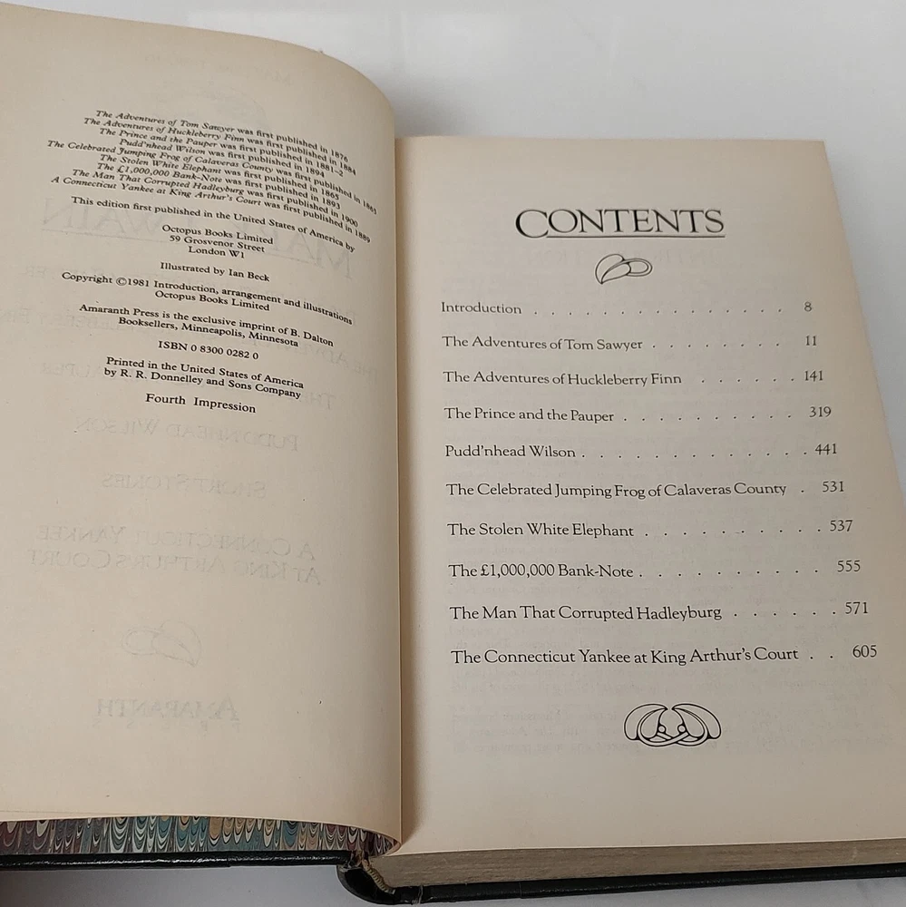 Mark Twain Master's Library 1981 Bonded Leather HC VG+ 800pp 9 stories. The inside is very good pre-owned condition.please see the photos as they are considered part of the description. The outside binding unfortunately is split half way down the front as noted in the photos and there are a couple of small nicks in the binding spine.
