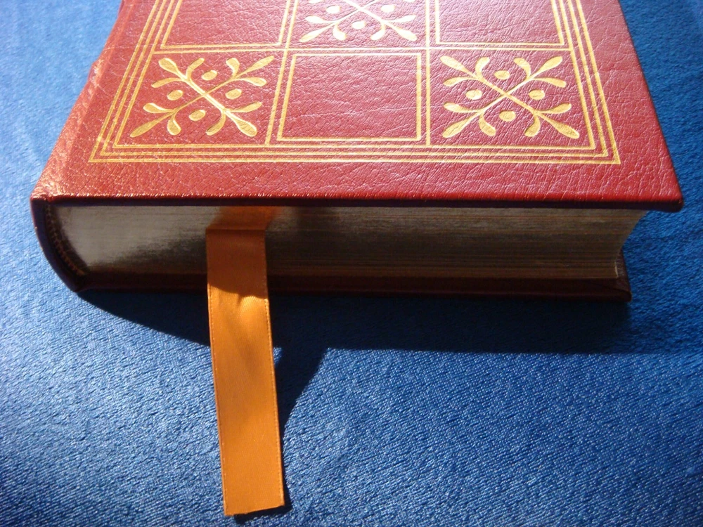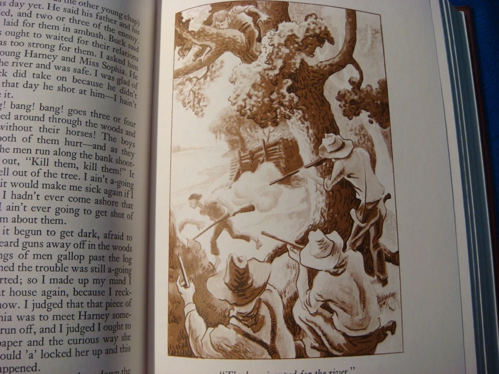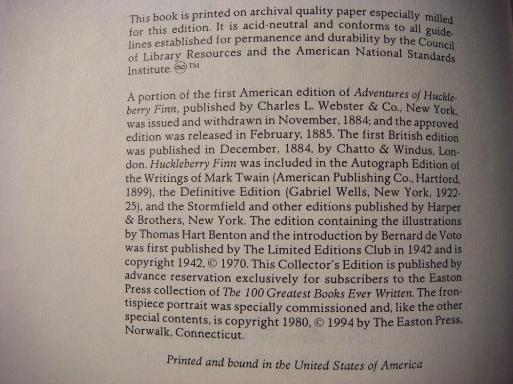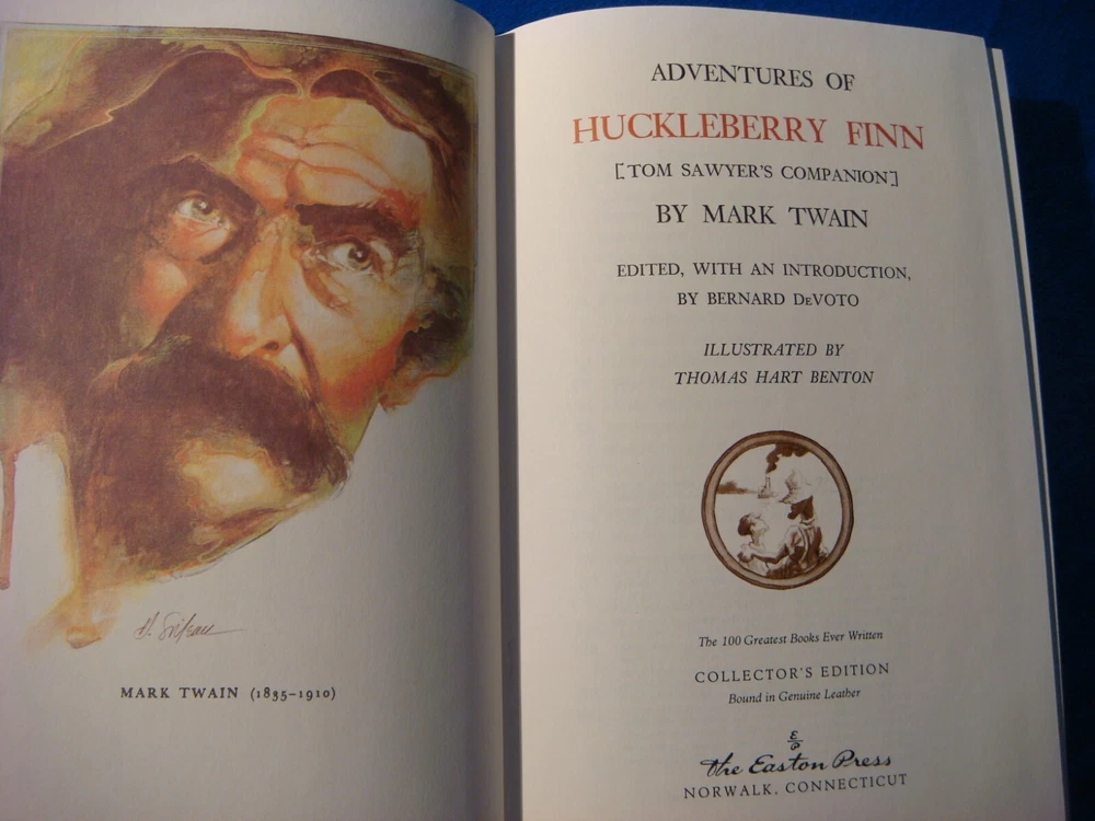 For sale a copy of The Adventures of Huckleberry Finn written by Mark Twain. The book is bound in genuine leather with gold inlays on covers and gold on the edges of the pages. The book is has 45 great illustrations. This is a beautiful book in excellent condition.