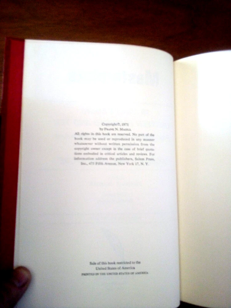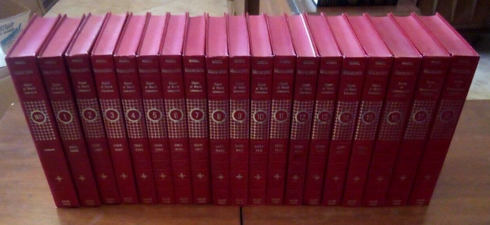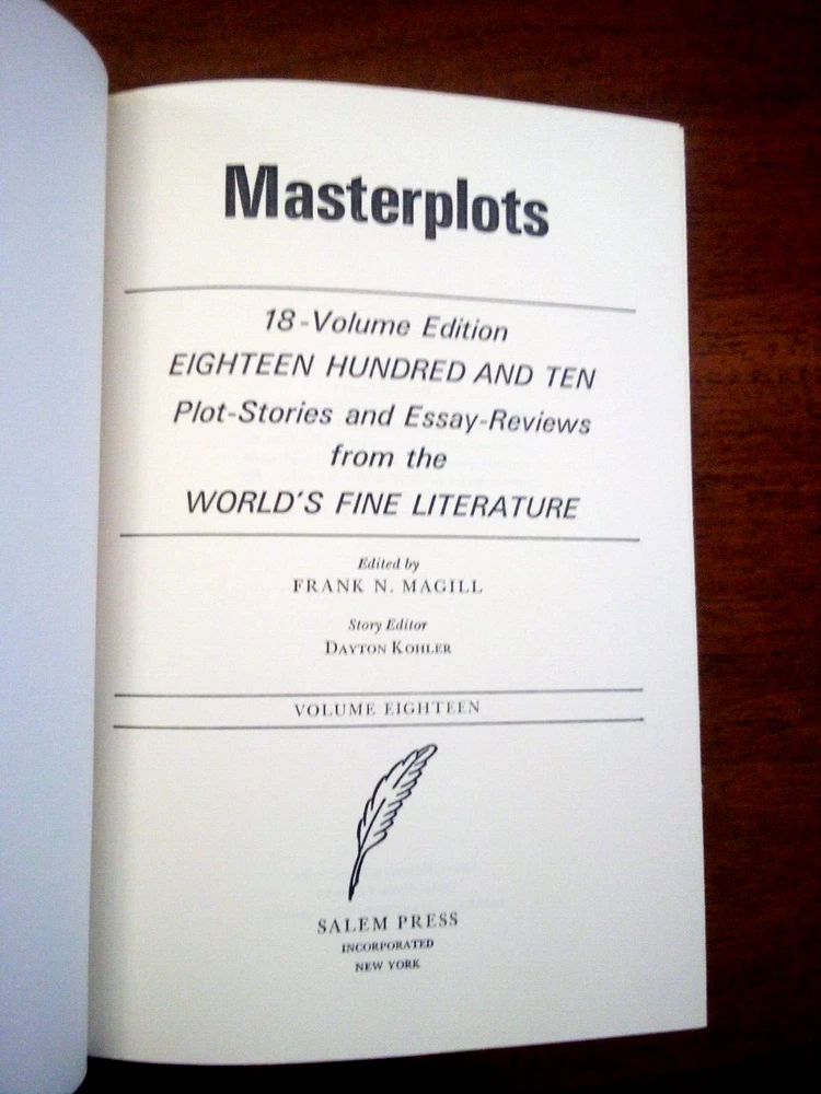 Masterplots: 18-Volume Edition EIGHTEEN HUNDRED TEN Plot-Stories and Essay-Reviews from the WORLD'S FINE LITERATURE Magill, Frank N. Published by Salem Press, 1971 Synopsis: This literary reference source contains entries on numerous titles and contains revised essays, critical evaluation sections, story segments and essay review segments. About the Author: Dr. Frank N. Magill has been a writer and editor of distinguished reference works for the past forty years. John K. Roth is Russell K. Pitzer Professor of Philosophy at Claremont McKenna College in Claremont, California. In 1988, he was named Professor of the Year by the Council for Advancement and Support of Education and the Carnegie Foundation for the Advancement of Teaching.