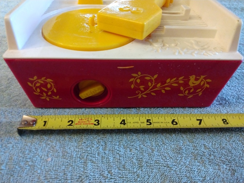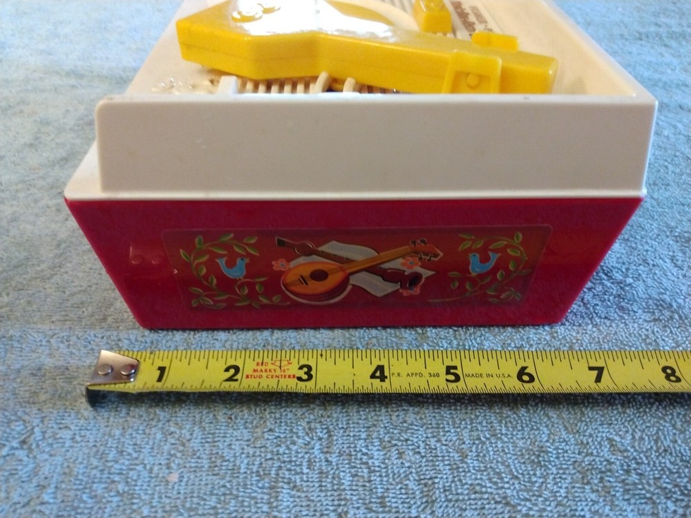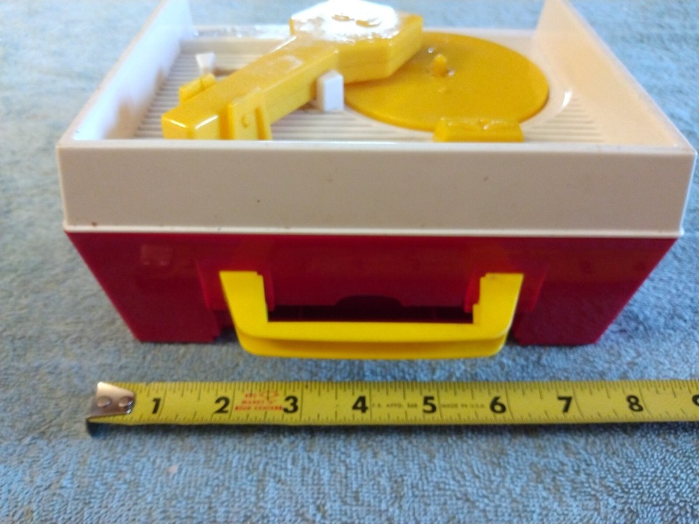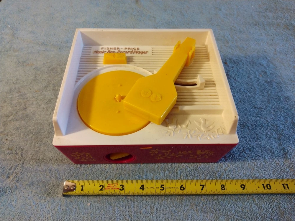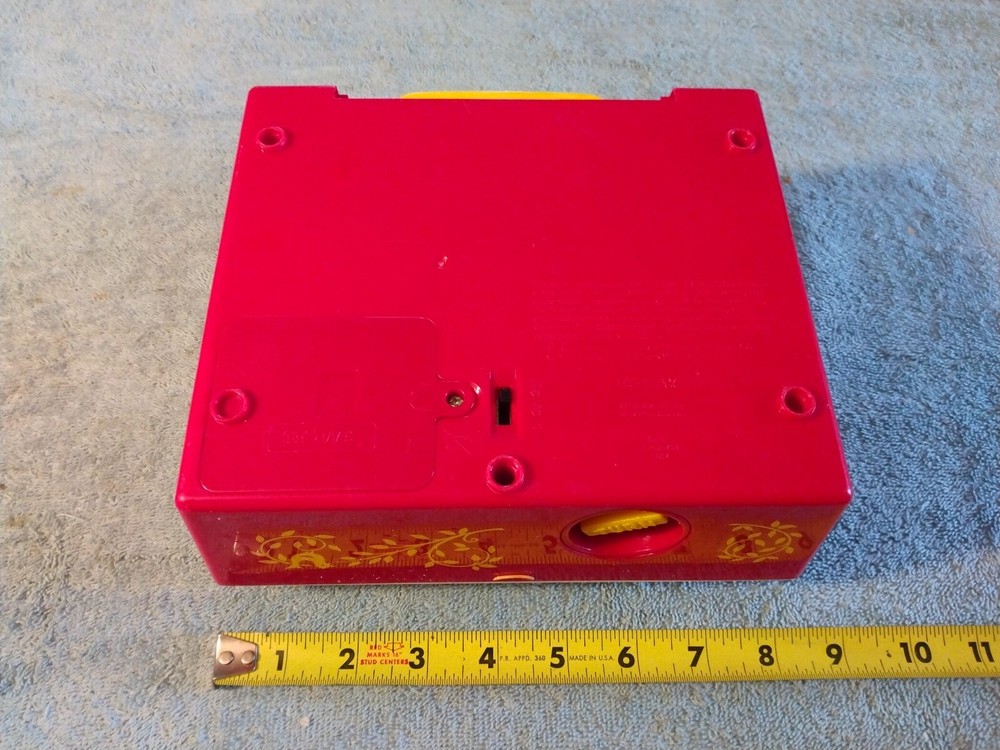 This is a Mattel Fisher Price Music Box Record Player from 2010. It is a musical toy that plays music when a record is inserted and turned. The brand is Mattel and it was made in China....