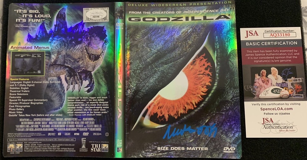 GODZILLA DVD SIGNED ON THE COVER BY MATTHEW BRODERICK. DVD IS IN VERY GOOD CONDITION. THE AUTOGRAPH IS SIGNED IN BLUE PAINT PEN AND CERTIFIED BY JSA. ALL REASONABLE OFFERS WILL BE CONSIDERED. FREE SHI...