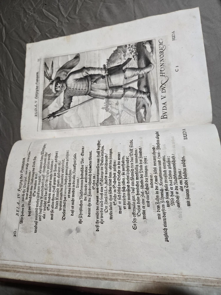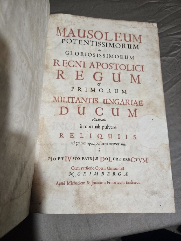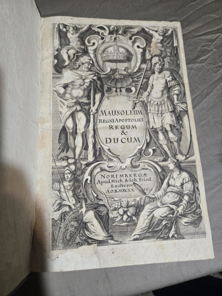 The text is in Latin, with a German version also included ("Cum versione Operis Germanicâ"). It honors the "most powerful and glorious kings and first dukes of the militant Kingdom of Hungary." The publication is attributed to Michael and Johann Friedrich Endter. The Nádasdy Mausoleum is a series of full-length portraits of Hun and Hungarian leaders and kings.1664