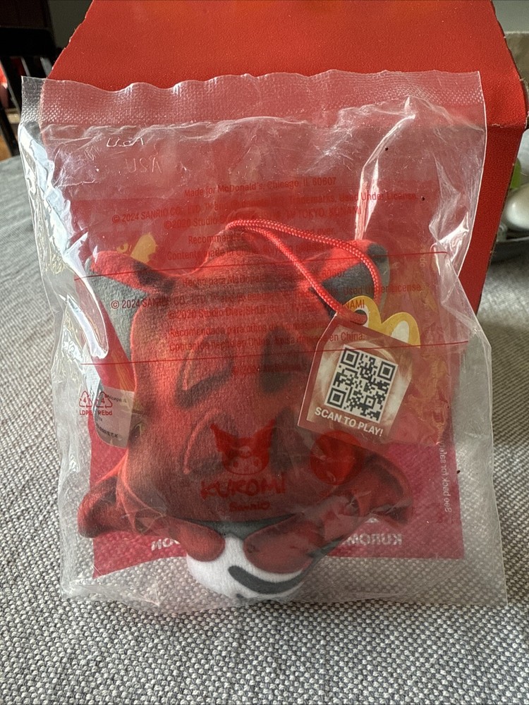 The product is a McDonald's Happy Meal toy featuring a collaboration between the characters Kuromi and Slifer The Sky Dragon from the Yu-Gi-Oh! and Hello Kitty franchises. This specific toy is numbered as #6 in the series, appealing to fans of both character families.