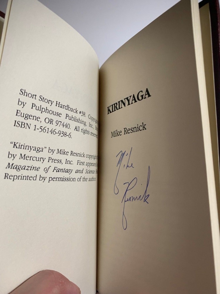 Michael Resnick. Kirinyaga. Pulphouse. 1992. 45 pages. Signed limited first edition leather bound. One of 100 copies of the Short Story Hardback Series. These hardbound books are small in size and measure aprox. 4.25" X 7". Fine and unread. As new. Shelf #10; 2@37. We usually ship books within 1 business day. All our books are shipped in boxes! About Us We have over seventy years combined experience buying, selling, collecting, shipping, and grading books. We are avid bibliophiles who rigorously grade our materials. If anything, we under grade. We love books, especially signed first editions, and we treat our books--eventually your books--with care and respect. Shipping All shipping costs are for inside the USA. For shipping outside of the USA, please contact us first. All books are packaged extremely well to preserve the book's condition. All books are shipped with USPS tracking via Media Mail unless other arrangements are made. Books are shipped within 3 business days of payment clearing. Returns If the book arrives and you have questions or concerns, please contact us immediately so we can work things out. If the condition is not as described, we are happy to refund your money and shipping both ways. If you simply want to return the book because you do not want it anymore, we will refund the purchase price of the book but not shipping. All returns must be handled within 30 days of receiving the book. Again, if you have any questions, please contact us immediately. Pulphouse Axolotl