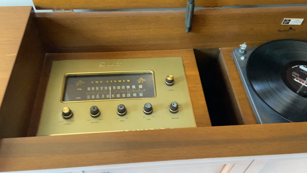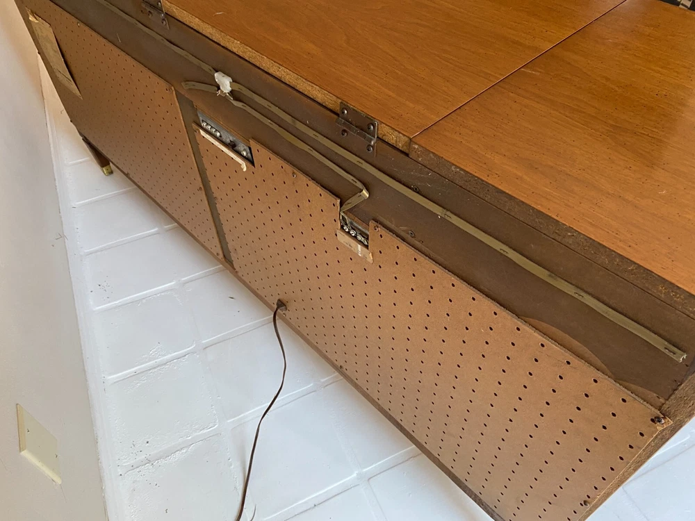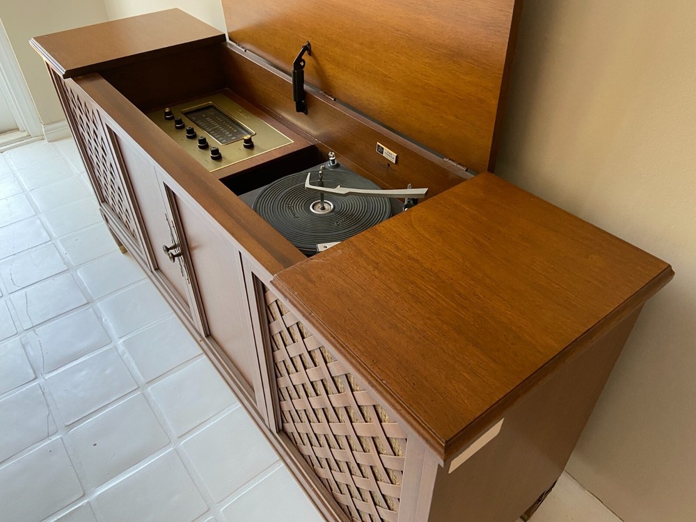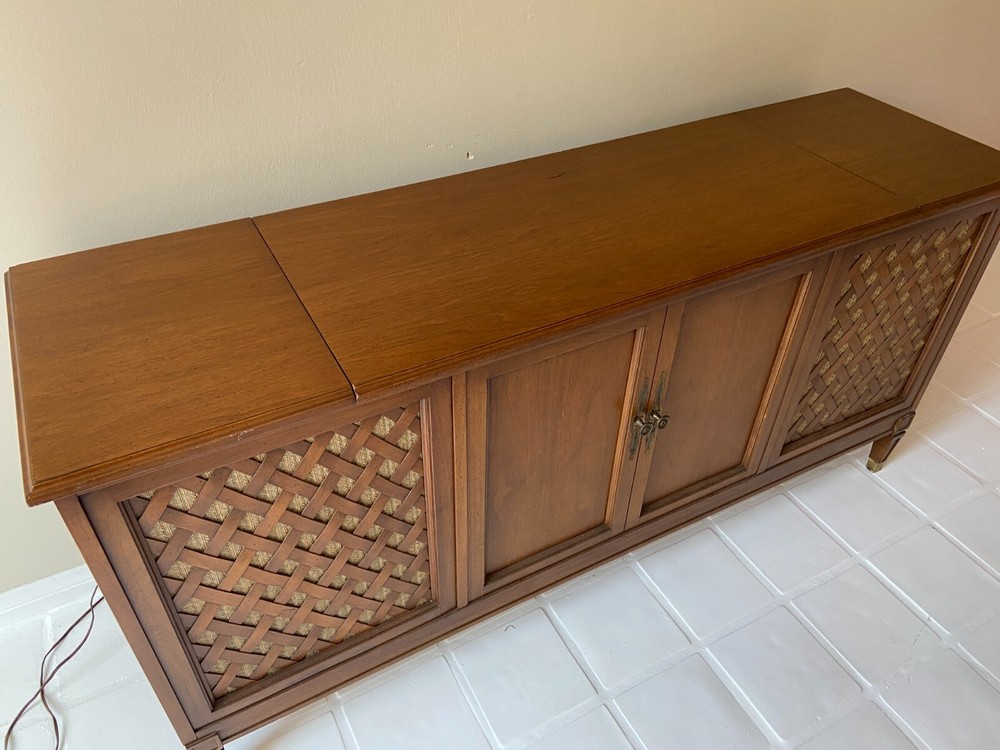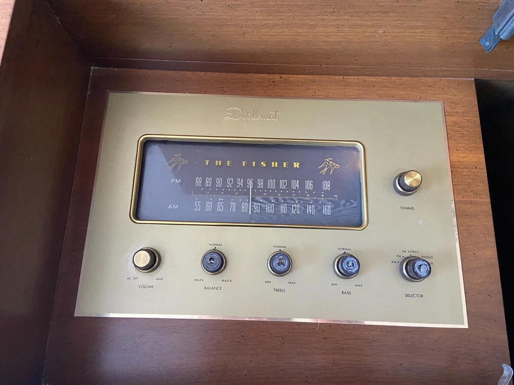 This is a 1964 Fisher Console radio/record player with center record storage...the unit powers on and I was able to recieve several static prone stations. The record player turns-on but did not play due to lack of cartridge. The left speaker plays intermittantly at best, usually not. See photos for overall cosmetic condition. This unit is sold as-is with no returns/no refunds. PLEASE NOTE: If you're out of the area the following shipping services will provide price quotes and pick-up arrangements: U-Ship, Quick Transport Solutions, ShipHawk, Elephant Runners Transport Co or Taskrabbit and Dolly app on your phone...Dimensions: 60"L x 17"D x 29"H.
