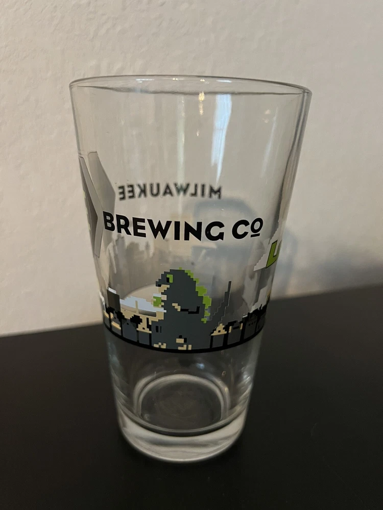 Milwaukee Brewing Co MKE Godzilla Lo•Gii Video Game Pint Beer Glasses Preowned EUC (see pictures), No Returns