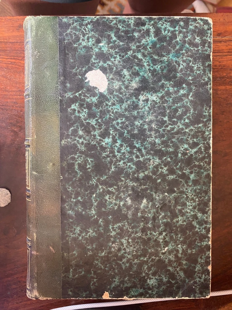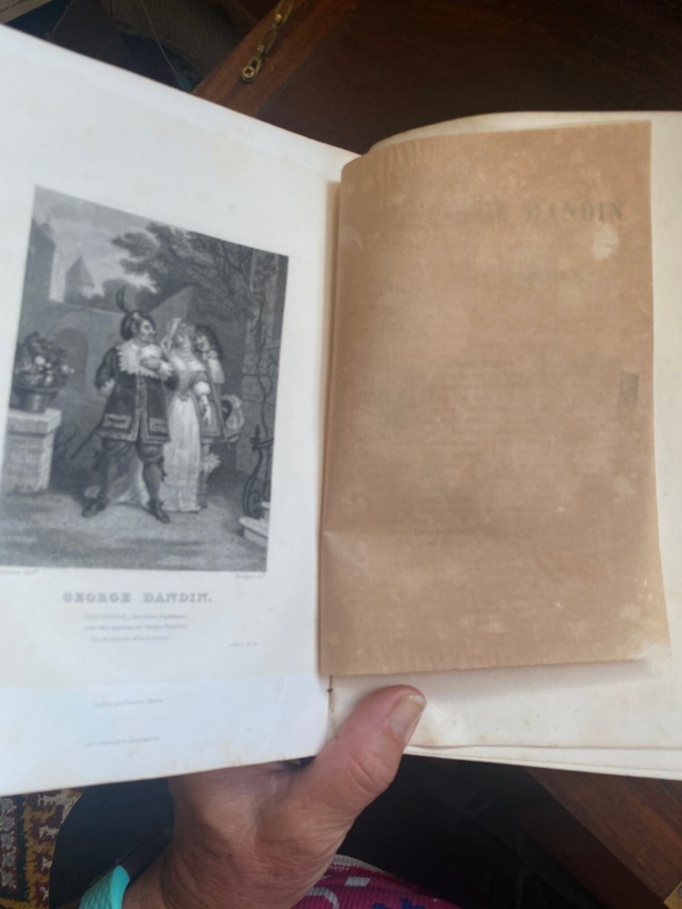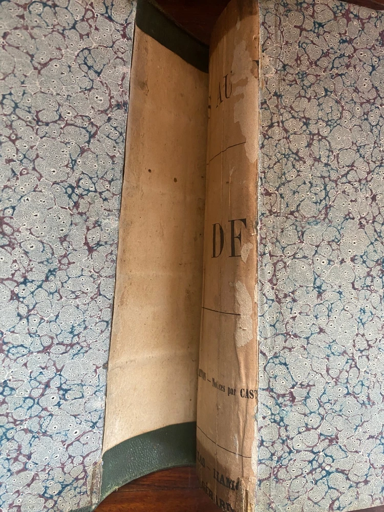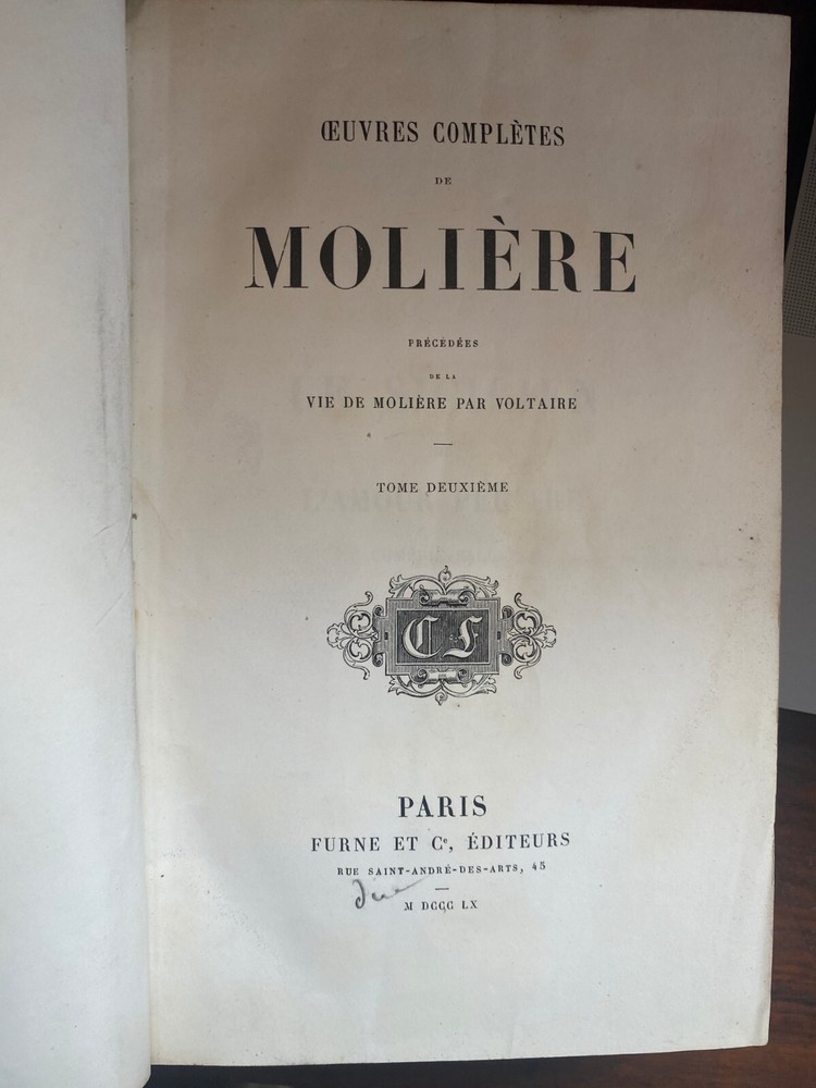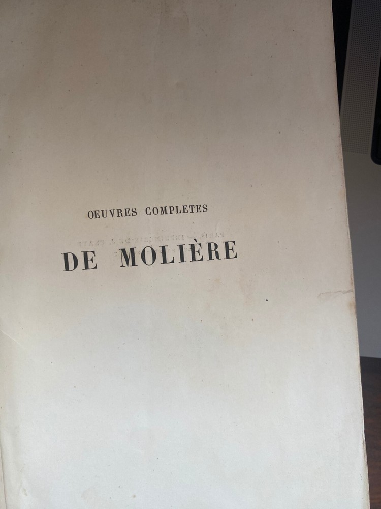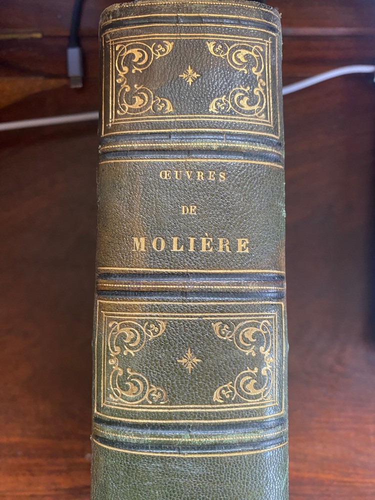Complete works of the French playwright Moliere; book 2. This beautifully-bound edition is from 1860 and comes from my family's collection. When my grandfather was a boy in France, children were given books as prizes for good grades in school. This book has been with us for a long time and it is quite rare. The spine shows leather binding and gold leaf engraved text and designs. It is in excellent condition for a book of its age. The only issue is where the inside cover has detached from the front end paper. The rest is in excellent condition and there are still parchment sheets to protect the illustrations at the beginning of each play. See photos for details.