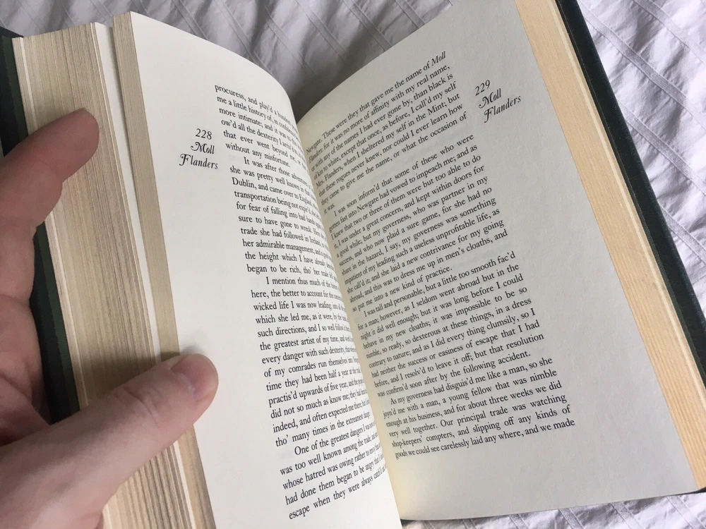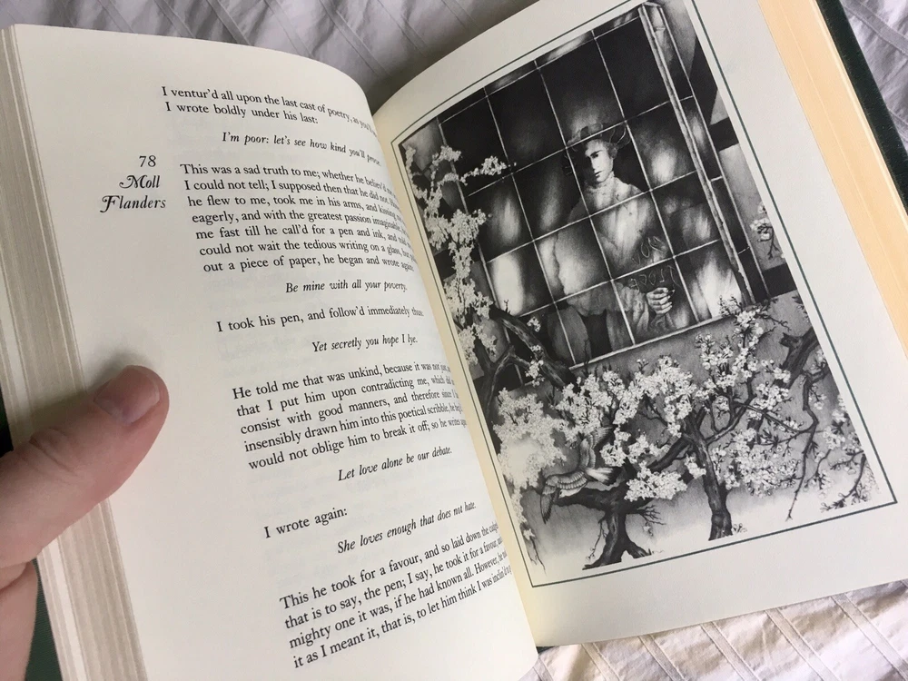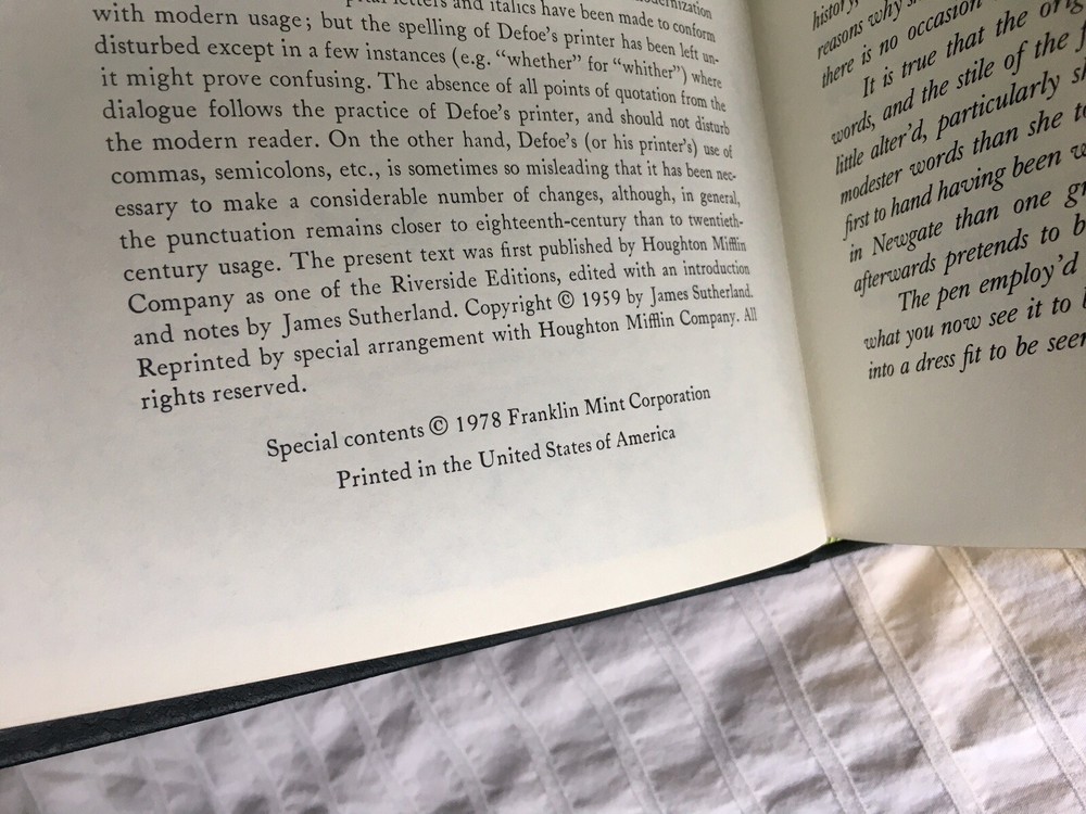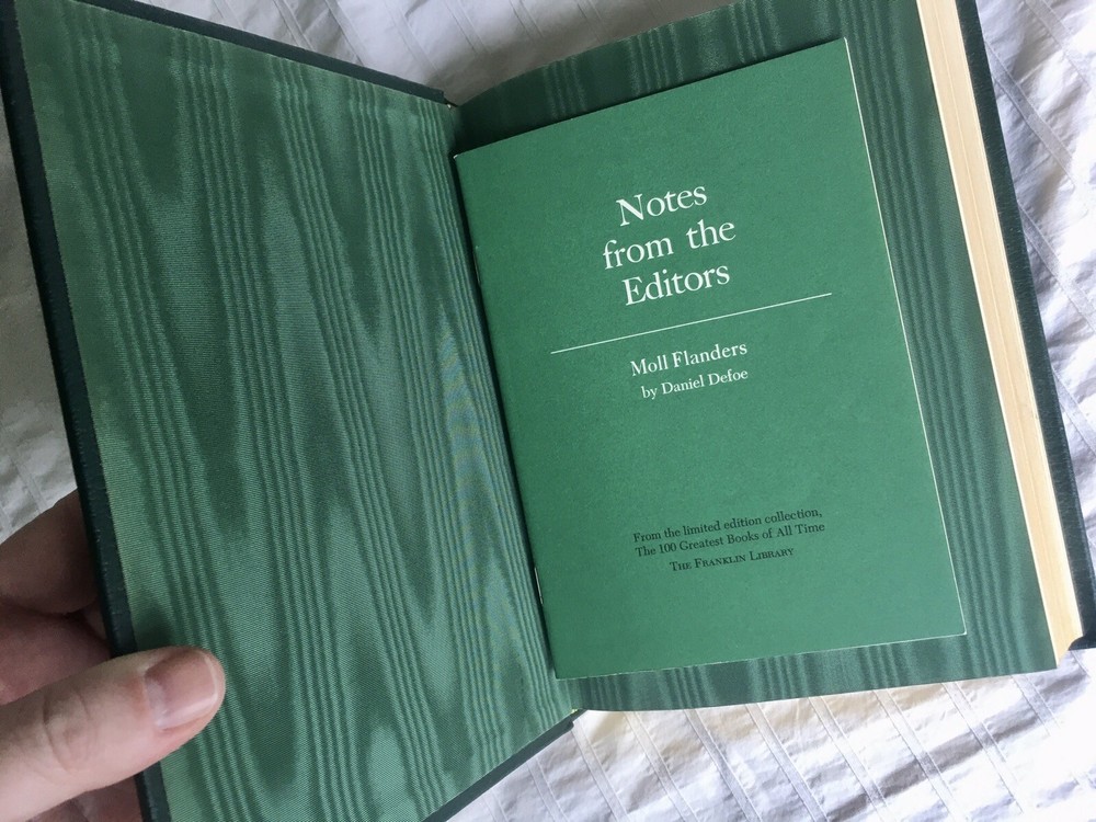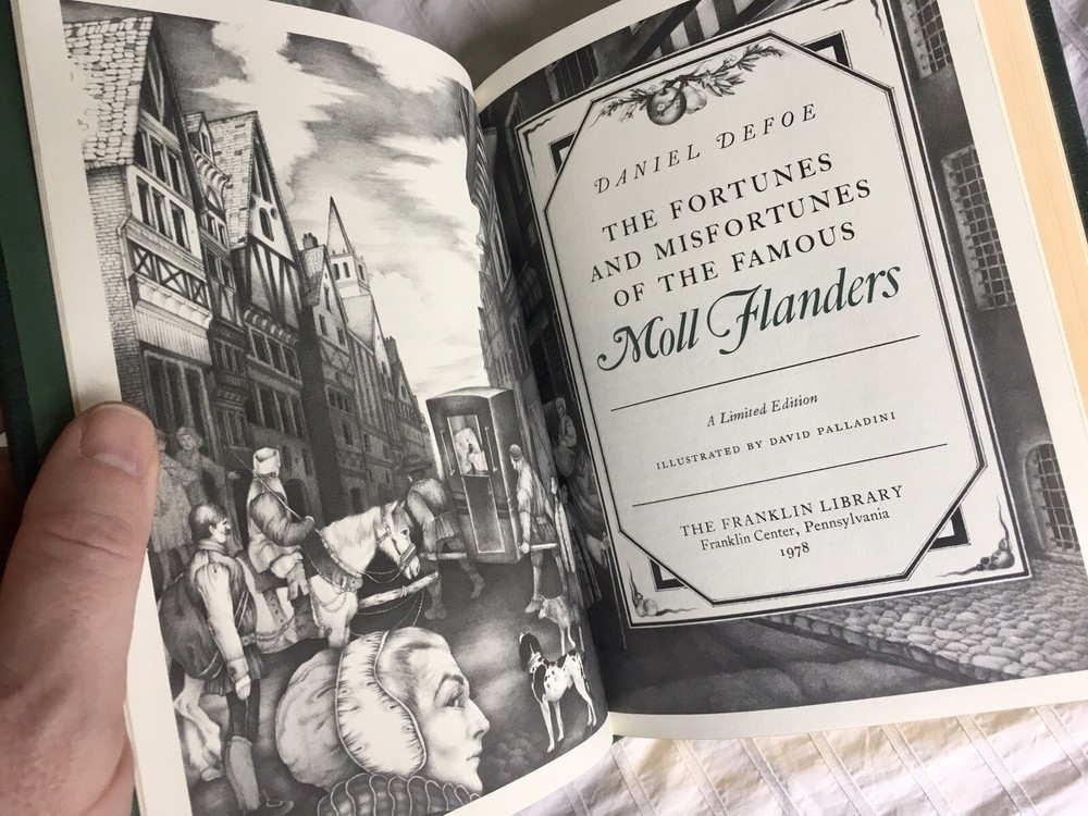 The Fortunes and Misfortunes of the Famous Moll Flanders by Daniel Defoe, Illustrated by David Palladini, Vintage 1978, Limited Edition from The Franklin Library "100 Greatest Books of All Time" Collection, Includes "Notes from the Editors" Booklet Limited edition, premium leather bound with hubbed spines and 22kt gold accents, archival paper with gilded edges, moire fabric endleaves, silk ribbon bookmark, Smyth sewing and concealed muslin joints Book is in beautiful condition! Any imperfections are very minor. Appears to be unread. Smoke-free home. Shipping to USA only. Use eBay's Global Shipping Program for international.