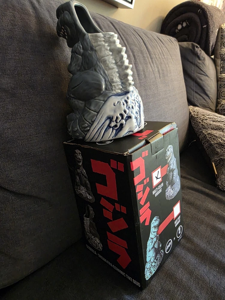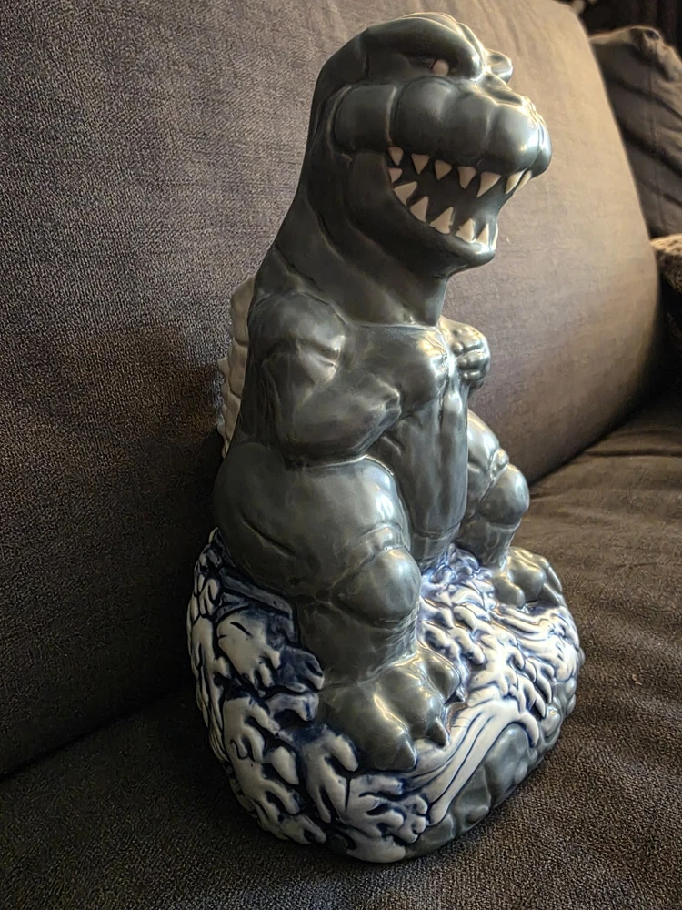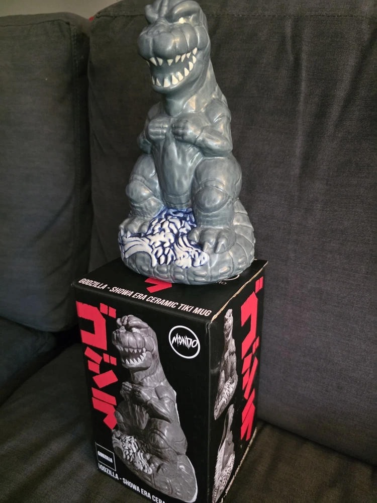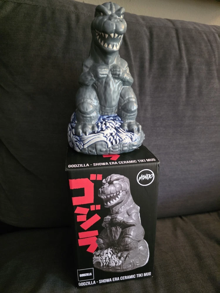 New, never used! SOLD OUT ON MONDO WEBSITE! Don't see this one much! Rare!!! Rising from the waves off the Tokyo coast is pop culture's preeminent prehistoric powerhouse himself, the gargantuan GODZILLA. In tribute to seven decades of reptilian wrath, artists Hector Arce, Mikey Bonanno and Tufan Sezer have tiki-fied cinema's most iconic lizard for the first time EVER, circa his battle-heavy, blood-soaked 1974 fan favorite GODZILLA VS. MECHAGODZILLA. Perched upon a Pacific tsunami and ready to annihilate his destructive digital doppelganger (while also providing you with radioactive refreshment), the GODZILLA '74 Tiki Mug is a monumental masterwork of dinosaur drinkware. NOTE: These mugs are handmade, making each one unique, so slight variations from images shown may occur.