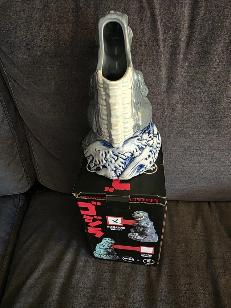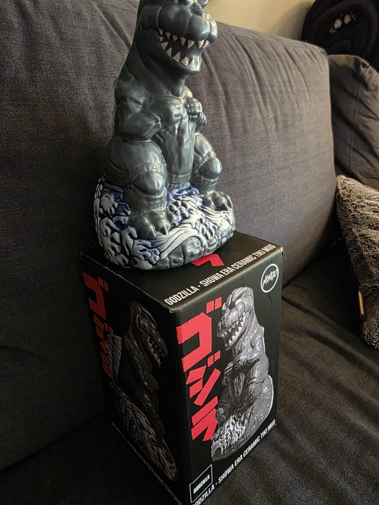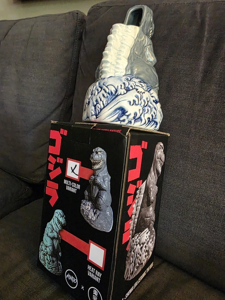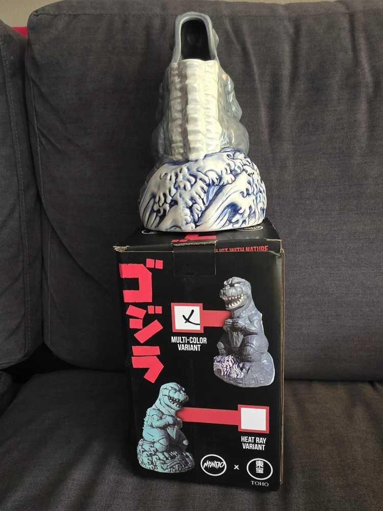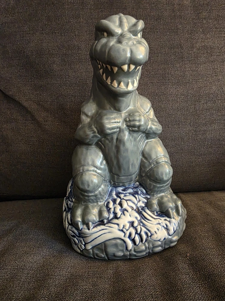 New, never used! SOLD OUT ON MONDO WEBSITE! Don't see this one much! Rare!!! Rising from the waves off the Tokyo coast is pop culture's preeminent prehistoric powerhouse himself, the gargantuan GODZILLA. In tribute to seven decades of reptilian wrath, artists Hector Arce, Mikey Bonanno and Tufan Sezer have tiki-fied cinema's most iconic lizard for the first time EVER, circa his battle-heavy, blood-soaked 1974 fan favorite GODZILLA VS. MECHAGODZILLA. Perched upon a Pacific tsunami and ready to annihilate his destructive digital doppelganger (while also providing you with radioactive refreshment), the GODZILLA '74 Tiki Mug is a monumental masterwork of dinosaur drinkware. NOTE: These mugs are handmade, making each one unique, so slight variations from images shown may occur.