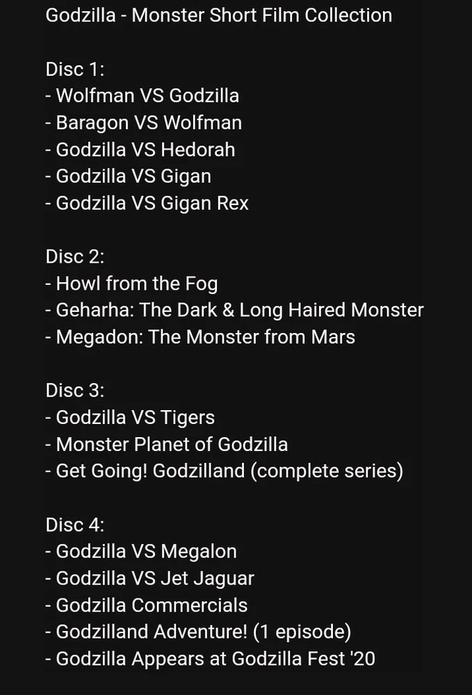 Manufactured On Demand - Item is sold for fans. Public Domain movie. Region 1 DVD-R. SHIPS FAST with USPS Tracking! Monster Short Film Collection - Giant Kaiju extravaganza! DVDs come in decorative plastic sleeves. Will be well packed & labeled to avoid damage. Please ask all questions prior to purchasing. Thank you. Collection includes: Disc 1: - Wolfman VS Godzilla - Baragon VS Wolfman - Godzilla VS Hedorah - Godzilla VS Gigan - Godzilla VS Gigan Rex Disc 2: - Howl from the Fog - Geharha: The Dark & Long Haired Monster - Megadon: The Monster from Mars Disc 3: - Godzilla VS Tigers - Monster Planet of Godzilla - Get Going! Godzilland (complete series) Disc 4: - Godzilla VS Megalon - Godzilla VS Jet Jaguar - Godzilla Commercials - Godzilland Adventure! (1 episode) - Godzilla Appears at Godzilla Fest '20 High quality video & audio. Please refer to photos. 4-disc set! Let us know if you are looking for other Movies or TV Shows. Manufactured on demand is a process which enables us to offer video content to consumers on recordable DVDs providing sales available on demand, 24/7, when a fan makes a purchase. It differs from traditional DVD releases as it is only produced on demand, rather than being stored in a warehouse and shipped to stores. Manufactured on demand uses DVD-Rs (the 'R' stands for 'recordable') that look like the discs you're used to and offer the same audio and image quality. This recordable media is used to manufacture titles on demand. Through manufacturing on demand, we're able to offer video content that might not otherwise be available for fans. Each disc comes in a plastic sleeve with artwork sticker and are packaged safely and securely to avoid any damage during transit. Orders ship in mailers that have a 'Handle with Care/Do Not Bend' label and are stamped 'Fragile' on it. By eliminating inventory, waste, and inefficiencies in the distribution system, on-demand manufacturing provides the added benefit of helping preserve the environment. Public domain video content includes media that becomes public domain 28yrs after it is made, unless the copyright holder renews the license. Media produced in the mid-70s became public domain in 2001. Media produced in the mid-80s became public domain in 2010.