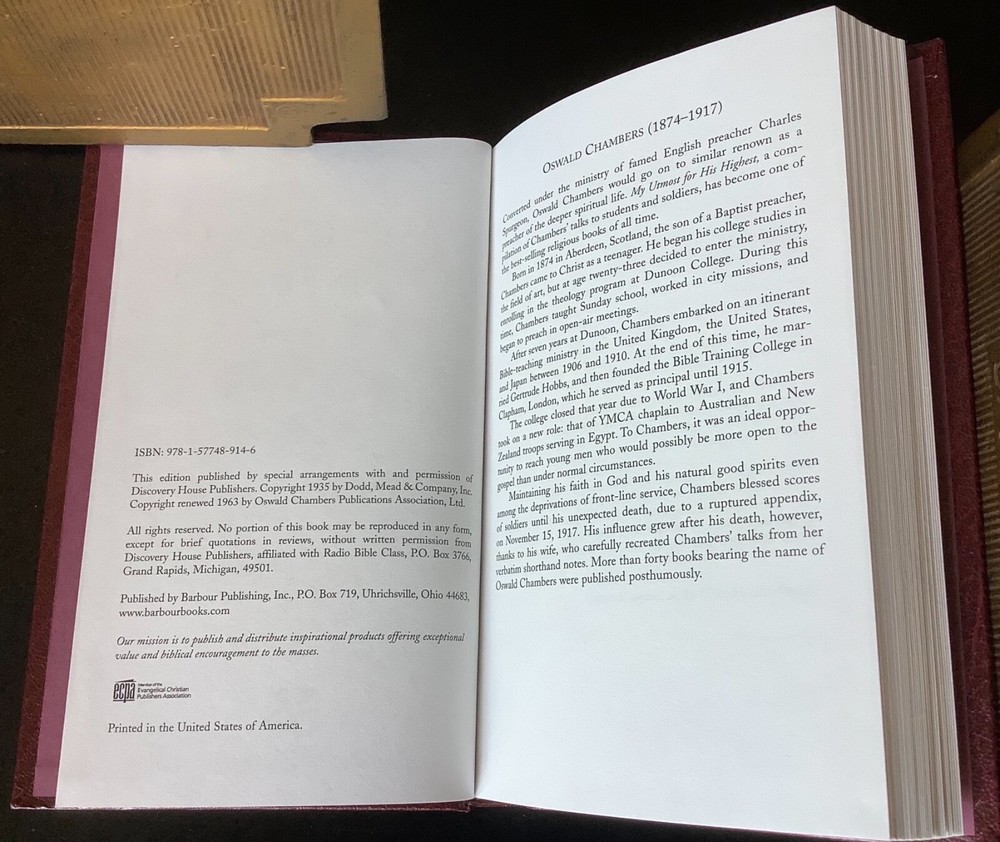 22You are bidding on a preowned hardcover edition of ‘My Utmost for His Highest’ by Oswald Chambers. Published by the Christian Library, copyright 1963. Book is in excellent condition - no writing, highlighting, underlining, tears, or creases. See photos. Thanks for looking. 220052
