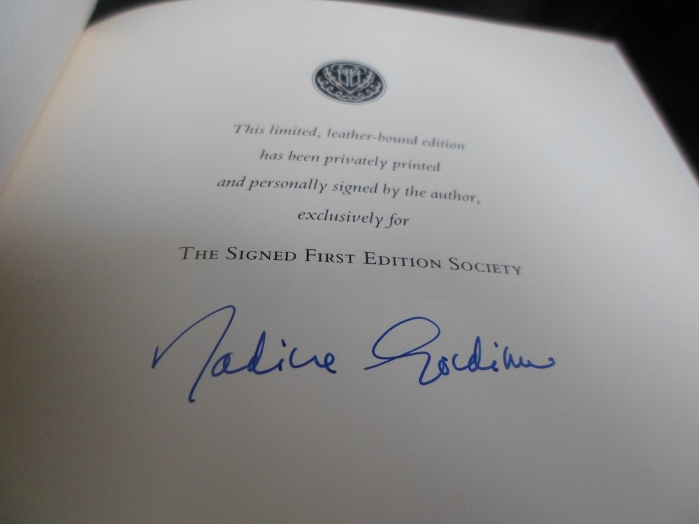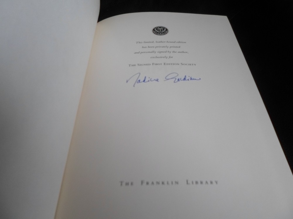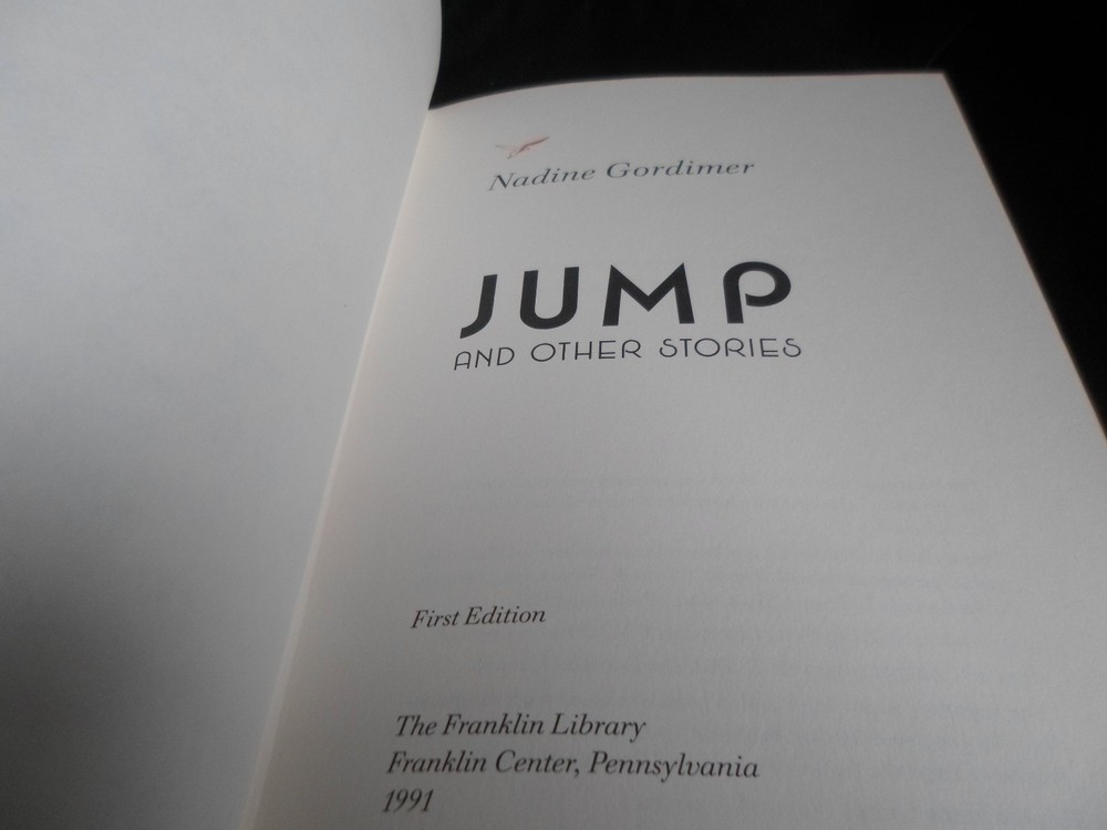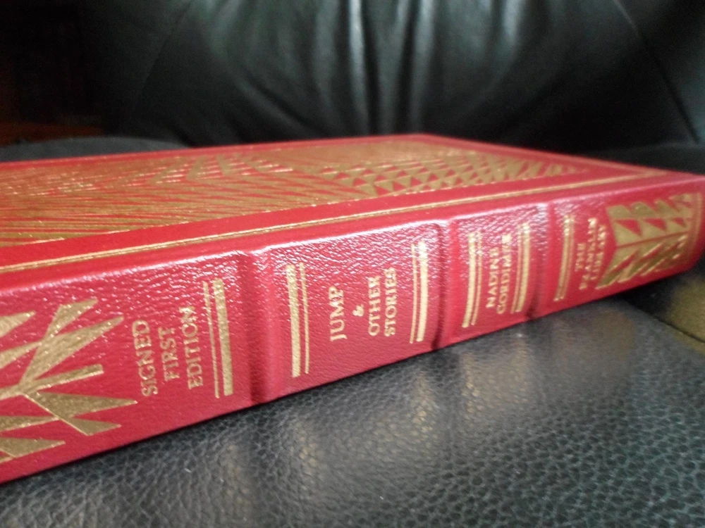 This is a leather bound signed limited first edition of Nadine Gordimer's best-selling collection - "Jump & Other Stories" , a fascinating anthology of short prose written by the South African author, winner of the Nobel Prize for Literature in 1991. The book is unread and in excellent condition (see images). Signed by the author on the limitation page, this is a true first edition, privately printed and personally signed by the author, exclusively for members of The Signed First Edition Society. Franklin Library was the first US company to introduce series of leather-bound luxury signed books and was subsequently acquired by The Easton Press, which continued the tradition. Just like Easton Press books, Franklin Library books are the golden standard in the publishing industry, highly collectible and lasting generations. Franklin Library Full Genuine Leather Hubbed Spine Accented Wit 22 kt. Real Gold Satin Ribbon Page Marker Distinctive Cover Design Gilded Page Edges To Protect Against Humidity High Quality Acid - Free paper Smyth-Sewn Pages I combine multiple items for savings on shipping charges. I ship worldwide. Please ask about international shipping charges and/or different shipping options. Thank you!