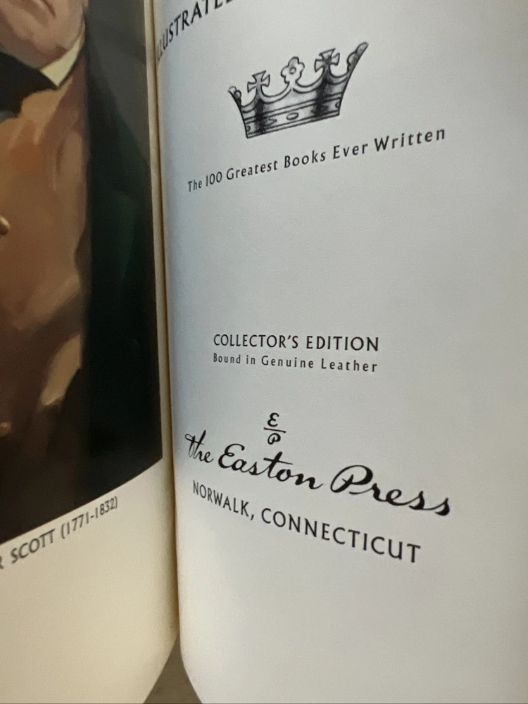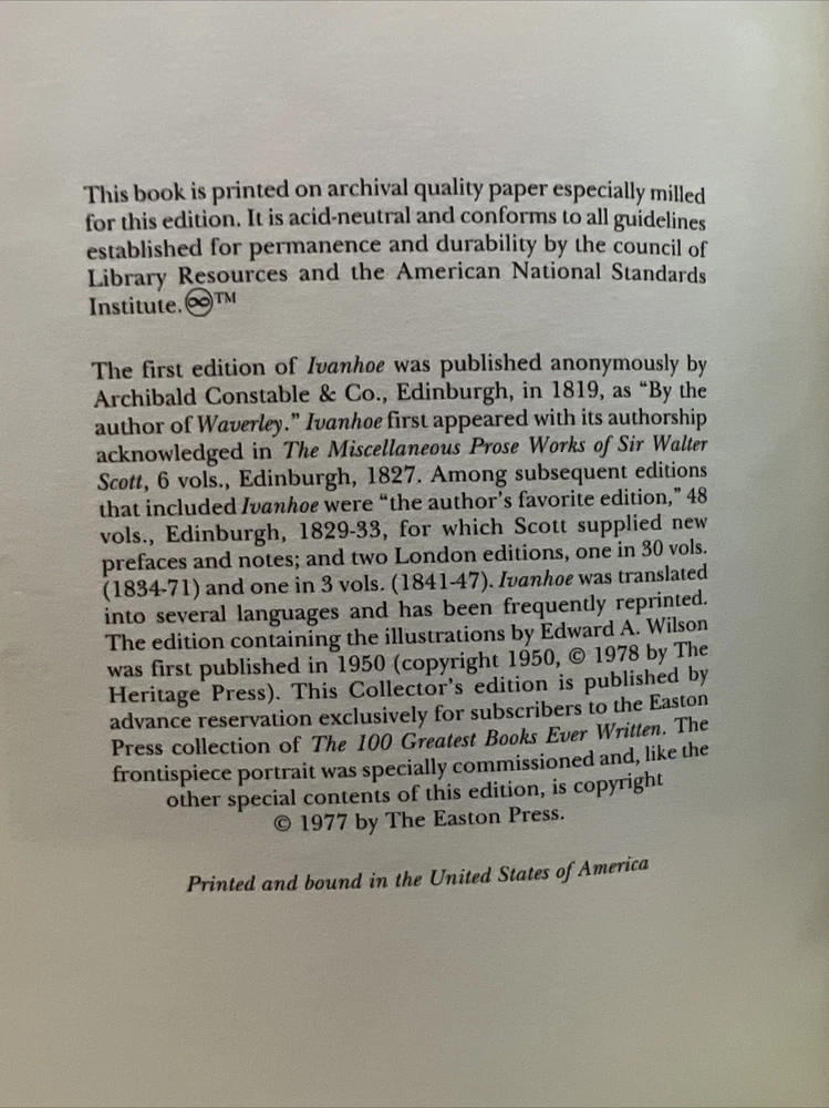 This beautifully crafted book from The Easton Press is a must-have for any collector of classic literature. Published in Norwalk, Connecticut in 1977, this leather-bound edition of Sir Walter Scott's Ivanhoe is a timeless piece of history. Previous owner's name in front. See all photos. Has spots on the gold edging bottom