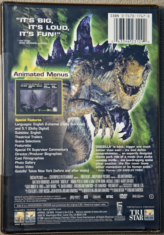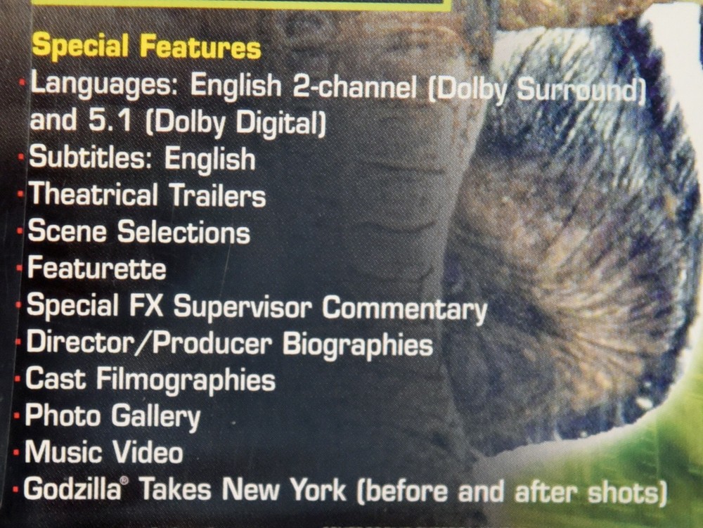 | Features | Widescreen, 5.1 Dolby Digital, Theatrical trailers, Scene selections, Featurette (-unknown?), Special FX Supervisor commentary, Director/producer biographies, Cast Filmographies, Photo gallery, Music Video, Godzilla Takes New York (before & after shots) |