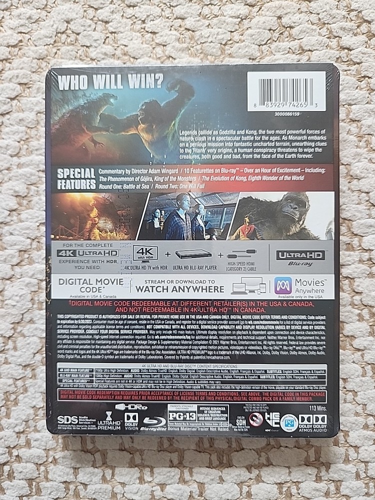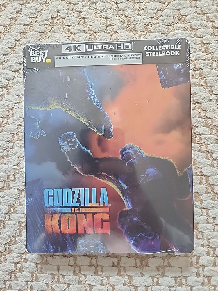 Will ship in a box, well protected. See pictures. Steelbook is sealed, never opened. Looks like a small dent and scratch on the top corners. Experience the epic battle of the titans with the brand new, sealed "Godzilla vs. Kong" 2021 4K & Blu-ray Best Buy Exclusive SteelBook. This action-packed movie, featuring creatures and monsters that will leave you on the edge of your seat, is a must-have for fans of the genre. This limited edition SteelBook, with its sleek design, is the perfect addition to any collection. The movie, released by Warner Bros, is available in English language and will keep you entertained for hours. Don't miss out on this fantastic movie and add it to your collection today.