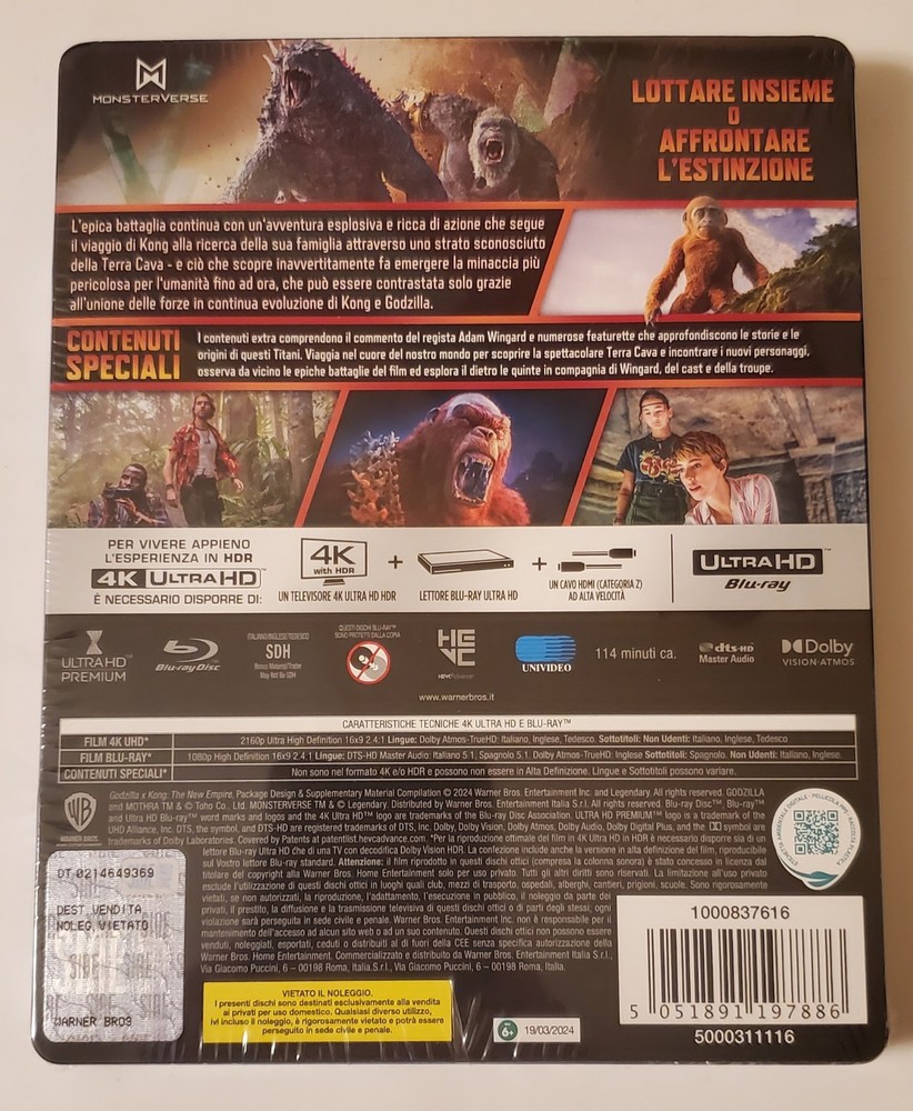 NEW SEALED Godzilla x Kong: The New Empire - 2024 4K & Blu-ray Steelbook Italian release. Discs and film in English. Please see the pictures of the actual item you will receive. Ships securely in a box with padding. Please check out my other listings for more great movies.